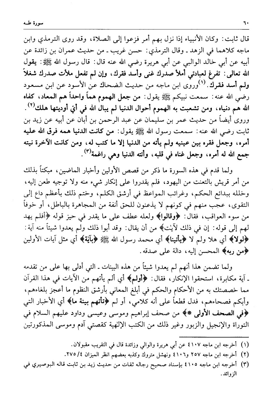 قال ثابت : وكان الأنباء إذا نزل بهم أمر فزعوا إلى الصلاة ، وقد روى الترميذي وابن ماجه كلاهما في الزهد - وقال الترميذي : حسن غريب - من حديث عمران بن زائدة عن أبيه عن أبي خالد الوالبي عن أبي هريرة رضي الله عنه قال : قال رسول الله ( صلى الله عليه وسلم ) : ( يقول الله تعالى : تفرغ لعبادتي أملأ صدرك غنى وأسد فقرك ، وإن لم تفعل ملأت صدرك شغلاً ولم أسد فقرك .
