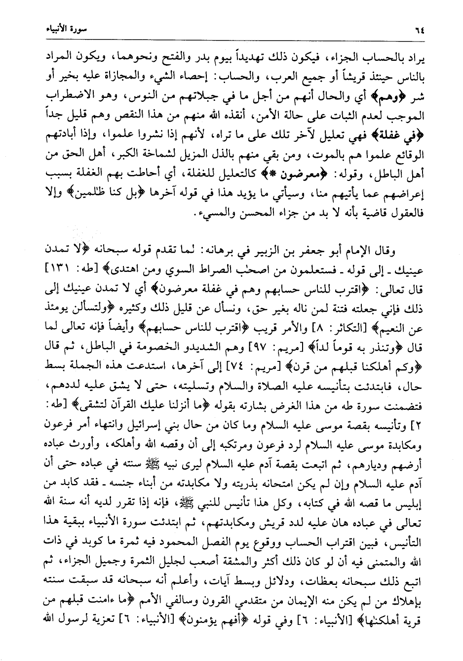 [ طه : 2 ] وتأنيسه بقصة موسى عليه السلام وما كان من حا ل بني إسرائيل وانتهاء أمر فرعون ومكابدة موسى عليه السلام لرد فرعون ومرتكبه إلى أن وقصه الله ، وأهلكه ، وأورث عباده أرضهم وديارهم ، ثم اتبعت بقصة آدم عليه السلام ليرى نبيه ( صلى الله عليه وسلم ) سنته في عباده حتى أن آدم عليه السلام وإن لم يكن امتحانه بذريته ولا مكابدته من أبناء جنسه - فقد كابد من إبليس ما قصه الله في كتابه ، وكل هذا تأنيس للنبي ( صلى الله عليه وسلم ) ، فإنه إذا تقرر لديه أنه سنة الله تعالى في عبادة هان عليه لدد قريش ومكابدتهم ، ثم ابتدئت سورة الأنبياء ببقية هذا التأنيس ، فبين اقتراب الحساب ووقوع يوم الفصل المحمود فيه ثمرة ما كوبد في ذات الله والمتمنى فيه أن لو كان ذلك أكثر والمشقة أصعب لجليل الثمرة وجميل الجزاء ، ثم اتبع ذلك سبحانه بعظات ، ودلائل وبسط آيات ، وأعلم أنه سبحانه قد سبقت سنته بإهلاك من لم يكن منه الإيمان من متقدمي القرون وسالفي الأمم