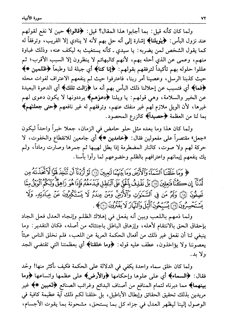 ) وَمَا خَلَقْنَا السَّمَآءَ وَالأَرْضَ وَمَا بَيْنَهُمَا لاَعِبِينَ لَوْ أَرَدْنَآ أَن نَّتَّخِذَ لَهْواً لاَّتَّخَذْنَاهُ مِن لَّدُنَّآ إِن كُنَّا فَاعِلِينَ بَلْ نَقْذِفُ بِالْحَقِّ عَلَى الْبَاطِلِ فَيَدْمَغُهُ فَإِذَا هُوَ زَاهِقٌ وَلَكُمُ الْوَيْلُ مِمَّا تَصِفُونَ وَلَهُ مَن فِي السَّمَاوَاتِ وَالأَرْضِ وَمَنْ عِنْدَهُ لاَ يَسْتَكْبِرُونَ عَنْ عِبَادَتِهِ وَلاَ يَسْتَحْسِرُونَ يُسَبِّحُونَ الْلَّيْلَ وَالنَّهَارَ لاَ يَفْتُرُونَ ( ( )