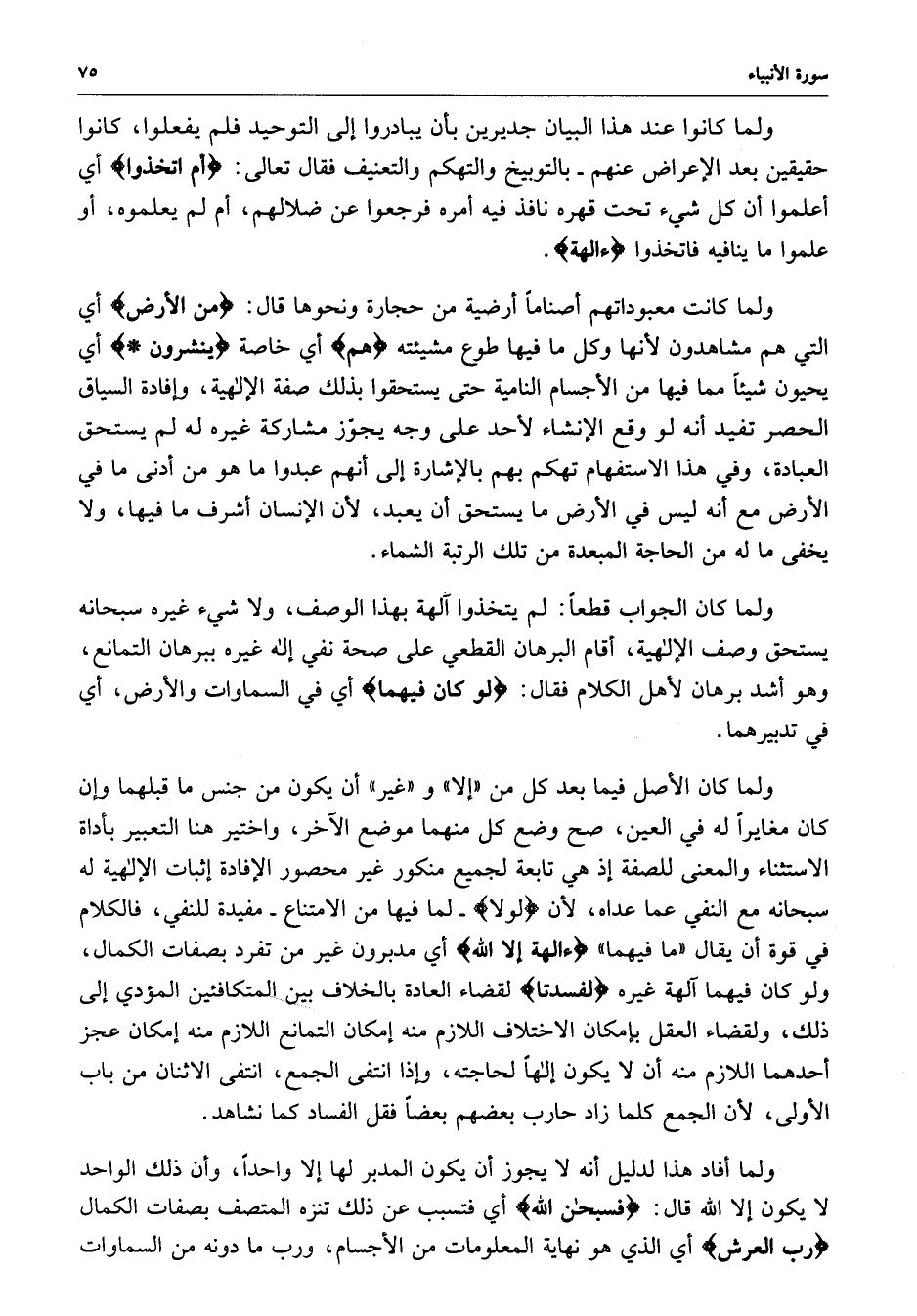 ولما كان الأصل فيما بعد كل من ( إلا ) و ( غير ) أن يكون من جنس ما قبلهما وإن كان مغيراً له في العين ، صح وضع كل منهما موضع الآخر ، واختير هنا التعبير بأداة الاستثناء والمعنى للصفة إذ هي تابعة لجميعع منكور غير محصور الإفادة إثبات الإلهية له سبحانه مع النفي عما عداه ، لأن ) لولا ( - لما فيها من الامتناع - مفيدة للنفي ، فالكلام في قوة أن يقال ( ما فيهما ) ) ءالهة إلا الله ) أي مدبرون غير من تفرد بصفات الكمال ، ولو كان فيهما آلهة غيره ) لفسدتا ( لقضاء العادة بالخلاف بين المتكافئين المؤدي إلى ذلك ، ولقضاء العقل بإمكان الاختلاف اللازم منه إمكان التمانع اللازم منه إمكان عجز أحدهما اللازم منه أن لا يكون إلهاً لحاجته ، وإذا انتفى الجمع ، انتفى الاثنانى من باب الأولى ، لأن الجمع كلما زاد حارب بعضهم بعضاً فقل الفساد كما نشاهد .