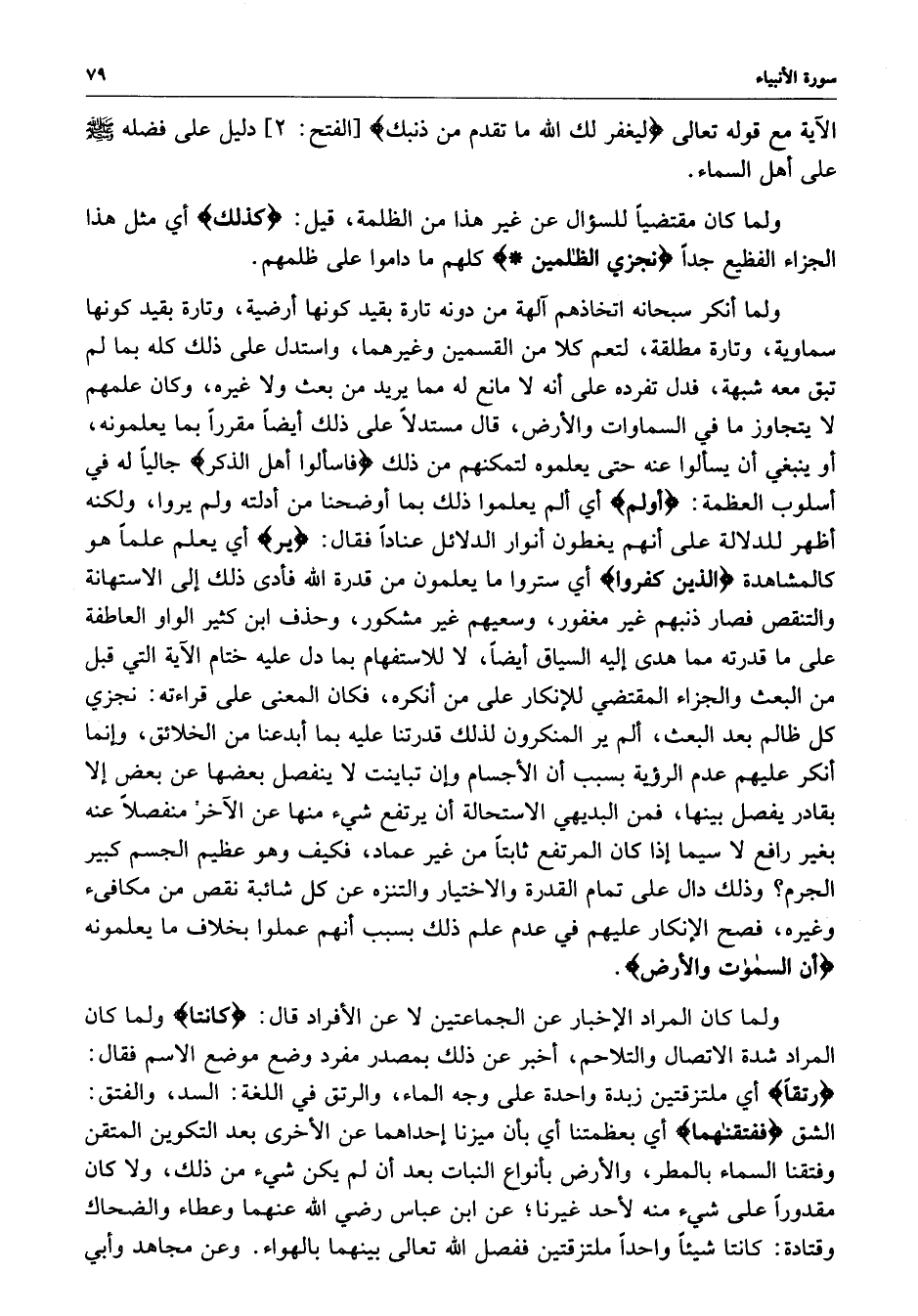ولما أنكر سبحانه اتخاذهم آلهة من دونه تارة بقيد كونها أرضية ، وتارة بقيد كونها سماوية ، وتارة مطلقة ، لتعم كلا من القسمين وغيرهما ، واستدل على ذلك كله بما لم تبق معه شبهة ، فدل تفرده على أنه لا مانع له مما يريد من بعث ولاغيره ، وكان علمهم لا يتجاوز ما في السموات والأرض ، قال مستدلاً على ذلك أيضاً مقرراً بما يعلمونه ، أو ينبغي أن يسألوا عنه حتى يعلموه لتمكنهم من ذلك ) فاسألوا أهل الذكر ( جلياً له في أسلوب العظمة : ( أولم ) أي ألم يعلموا ذلك بما أوضحنا من أدلته ولم يروا ، ولكنه أظهر للدلالة على أنهم يغطون أنوار الدلائل عناداً فقال : ( ير ) أي يعلم علماً هو كالمشاهدة ) الذين كفروا ) أي ستروا ما يعلمون من قدرو الله فأدى ذلك إلى الاستهانة والتنقص فصار ذنبهم غير مغفور ، وسعيهم غير مشكور ، وحذف ابن كثير الواو العاطفة على ما قدرته مما هدى إليه السياق أيضاً ، لا للاستفهام بما دل عليه ختام الآية التي قبلها من البعث والجزاء المقتضي للإنكار على من أنكره ، فكان المعنى على قراءته : نجزي كل ظالم بعد البعث ، ألم ير النمكرون لذلك قدرتنا عليه بما أبدعنا من الخلائق ، وإنما أنكر عليهم عدم الرؤية بسبب أن الأجسام وإن تباينت لا ينفصل بعضها عن بعض إلا بقادر يفصل بينهما ، فمن البديهي الاستحالة أن يرتفع شيء منها عن الآخر منفصلاً عنه بغير رافع لا سيما إذا كان المرتفع ثابتاً من غير عماد ، فكيف وهو عظيم الجسم كبير الجرم ؟ وذلك دال على تمام القدرة والاختيار والتنزه عن كل شائبة نقص من مكافىء وغيره ، فصح الإنكار عليهم في عدم علم ذلك بسبب أنهم عملوا بخلاف ما يعملونه ) إن السماوات والأرض ( .