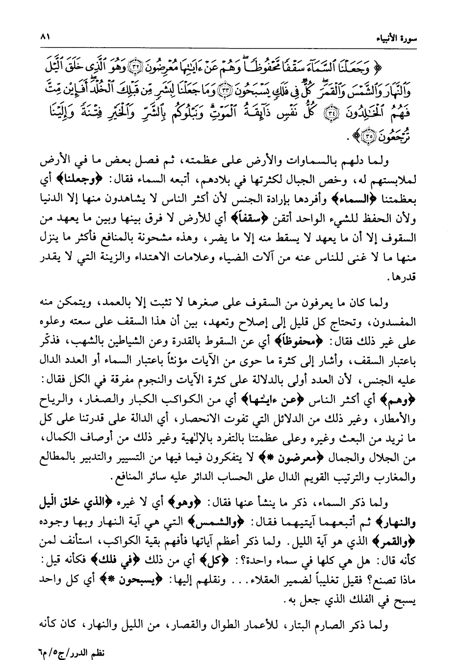 ) وَجَعَلْنَا السَّمَآءَ سَقْفاً مَّحْفُوظاً وَهُمْ عَنْ آيَاتِهَا مُعْرِضُونَ وَهُوَ الَّذِي خَلَقَ الْلَّيْلَ وَالنَّهَارَ وَالشَّمْسَ وَالْقَمَرَ كُلٌّ فِي فَلَكٍ يَسْبَحُونَ وَمَا جَعَلْنَا لِبَشَرٍ مِّن قَبْلِكَ الْخُلْدَ أَفَإِنْ مِّتَّ فَهُمُ الْخَالِدُونَ كُلُّ نَفْسٍ ذَآئِقَةُ الْمَوْتِ وَنَبْلُوكُم بِالشَّرِّ وَالْخَيْرِ فِتْنَةً وَإِلَيْنَا تُرْجَعُونَ ( ( )