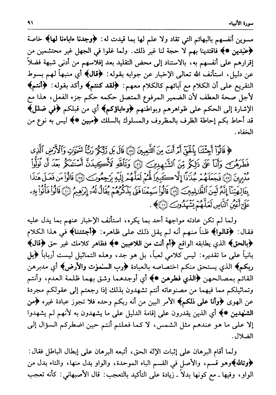 ) قَالُواْ أَجِئْتَنَا بِالْحَقِّ أَمْ أَنتَ مِنَ اللاَّعِبِينَ قَالَ بَل رَّبُّكُمْ رَبُّ السَّمَاوَاتِ وَالأَرْضِ الَّذِي فطَرَهُنَّ وَأَنَاْ عَلَى ذلِكُمْ مِّنَ الشَّاهِدِينَ وَتَاللَّهِ لأَكِيدَنَّ أَصْنَامَكُمْ بَعْدَ أَن تُوَلُّواْ مُدْبِرِينَ فَجَعَلَهُمْ جُذَاذاً إِلاَّ كَبِيراً لَّهُمْ لَعَلَّهُمْ إِلَيْهِ يَرْجِعُونَ قَالُواْ مَن فَعَلَ هَذَا بِآلِهَتِنَآ إِنَّهُ لَمِنَ الظَّالِمِينَ قَالُواْ سَمِعْنَا فَتًى يَذْكُرُهُمْ يُقَالُ لَهُ إِبْرَاهِيمُ قَالُواْ فَأْتُواْ بِهِ عَلَى أَعْيُنِ النَّاسِ لَعَلَّهُمْ يَشْهَدُونَ ( ( )