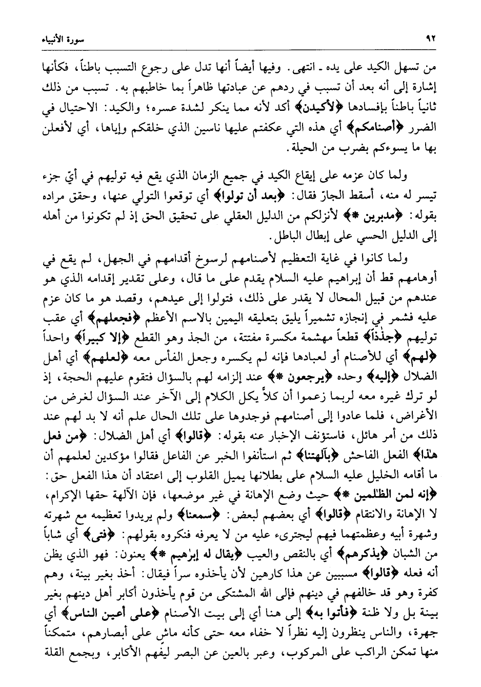 وفيها أيضاً أنها تدل على رجوع التسبب باطناً ، فكأنها إشارة إلى أنه بعد أن تسبب في ردهم عن عبادتها ظاهراً بما خاطبهم به ، تسبب من ذلك ثانياً باطناً بإفسادها ) لأكيدن ( أمد لأنه مما ينكر لشدة عسره ؛ والكيد : الاحتيال في الضرر ) أصنامكم ) أي هذه التي عكفتم عليها ناسين الذي خلقكم وإياها ، أي لأفعلن بها ما يسوكم بضرب من الحيلة .