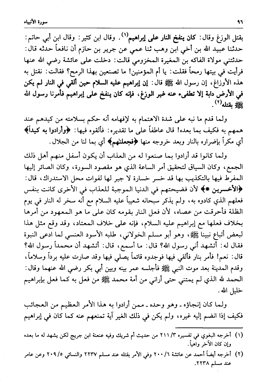 بقتل الوزغ وقال : ( كان ينفخ النار على إبراهيم ) وقال ابن كثير : وقال ابن أبي حاتم : حدثنا عبيد الله بن أخي وهب ثنا عمي عن جرير بن حازم أن نافعاً حدثه قال : حدثتني مولاة الفاكة بن المغيرة المخزومي قالت : دخلت على عائشة رضي الله عنها فرأيت في بيتها رمحاً فقلت : يا أم المؤمنين ما تصنعين بهذا الرمح ؟ فقالت : نقتل به هذه الأوزاغ ، إن رسول الله قال : ( إن إبراهيم عليه السلام حين ألقي في النار لم يكن في الأرض دابة إلا تطفىء عنه غير الوزغ ، فإنه كان ينفخ على إبراهيم فأمرنا رسول الله ( صلى الله عليه وسلم ) بقتله .
