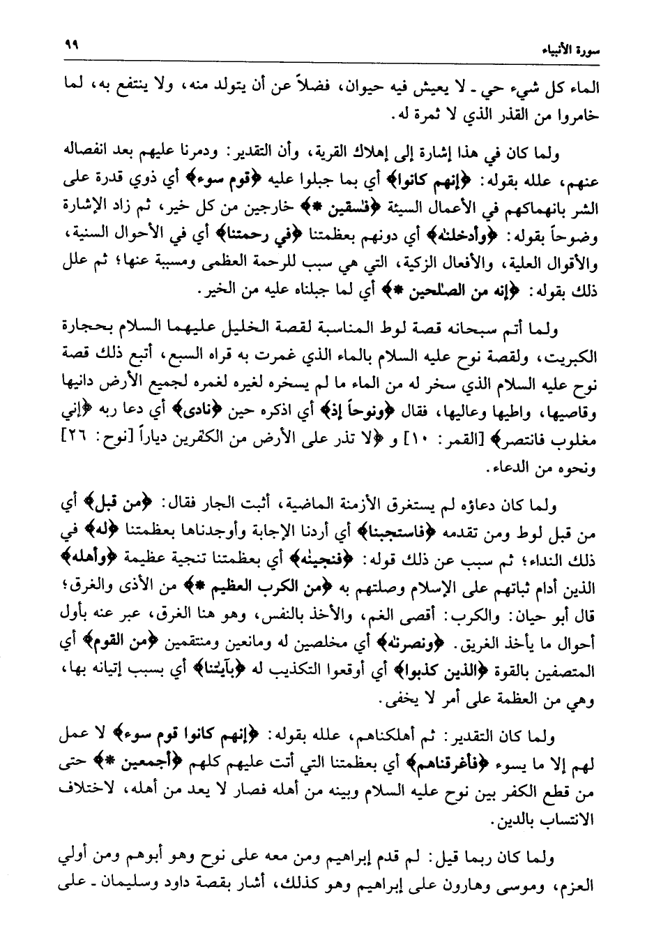 ولما أتم سبحانه قصة لوط المناسبة لقصة الخليل عليهما السلام بحجارة الكبريت ، لقصة نوح عليه السلام بالماء الذي غمرت به قراه السبع ، أتبع ذلك قصة نوح عليه السلام الذي سخر له من الماء مل لم يسخره لغيره لغمره جميع الأرض دانيها وقاصيها ، واطيها وعاليها ، فقال : ( ونوحاً إذ ) أي اذكره حين ) نادى ) أي دعا ربه