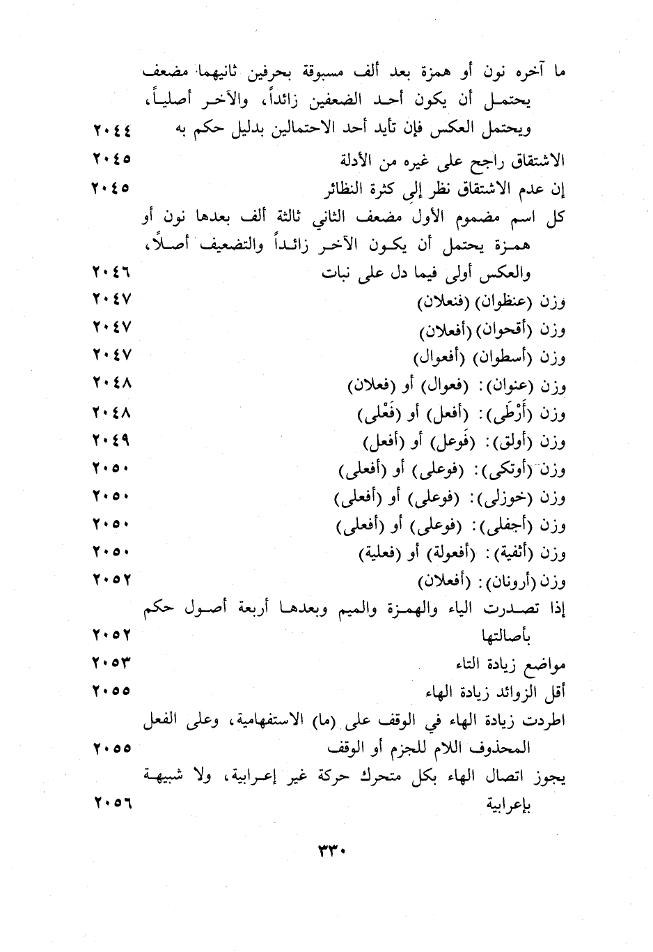 ما آخره نون أو همزة بعد ألف مسبوقة بحرفين ثانيهما مضعف يحتمل أن يكون أحد الضعفين زائدا، والأخر أصليا، ويحتمل العكس فإن تأيد أحد الاحتمالين بدليل حكم به 2044