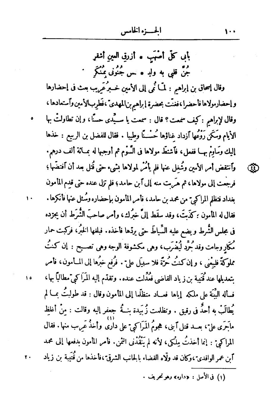 فقال له المأمون: كذبت، وقد سقط إلىّ خبرك، وأمر صاحب الشّرط أن يجرّده فى مجلس الشّرط ويضع عليه السّياط حتى يردّها فأخذه. فبلغها الخبر، فركبت حمار مكار وجاءت وقد جرّد ليضرب، وهى مكشوفة الوجه وهى تصيح: إن كنت مملوكة فليبعنى، وإن كنت حرّة فلا سبيل علىّ. فرفع خبرها إلى المأمون، فأمر بتعديلها عند قتيبة بن زياد القاضى فعدّلت عنده. وتقدّم إليه المراكبىّ مطالبا بها، فسأله البيّنة على ملكه إياها فعاد متظلّما إلى المأمون وقال: قد طولبت بما لم يطالب به أحد فى رقيق. وتظلمت زبيدة بنة جعفر إليه وقالت: من أغلظ ما جرى علىّ، بعد قتل ابنى، هجوم المراكبىّ على دارى [1] وأخذ عريب منها. فقال المراكبىّ: إنما أخذت ملكى، لأنه لم ينقدنى الثمن. فأمر المأمون بدفعها إلى محمد ابن عمر الواقدىّ، وكان قد ولّاه القضاء بالجانب الشرقىّ، فأخذها من قتيبة بن زياد