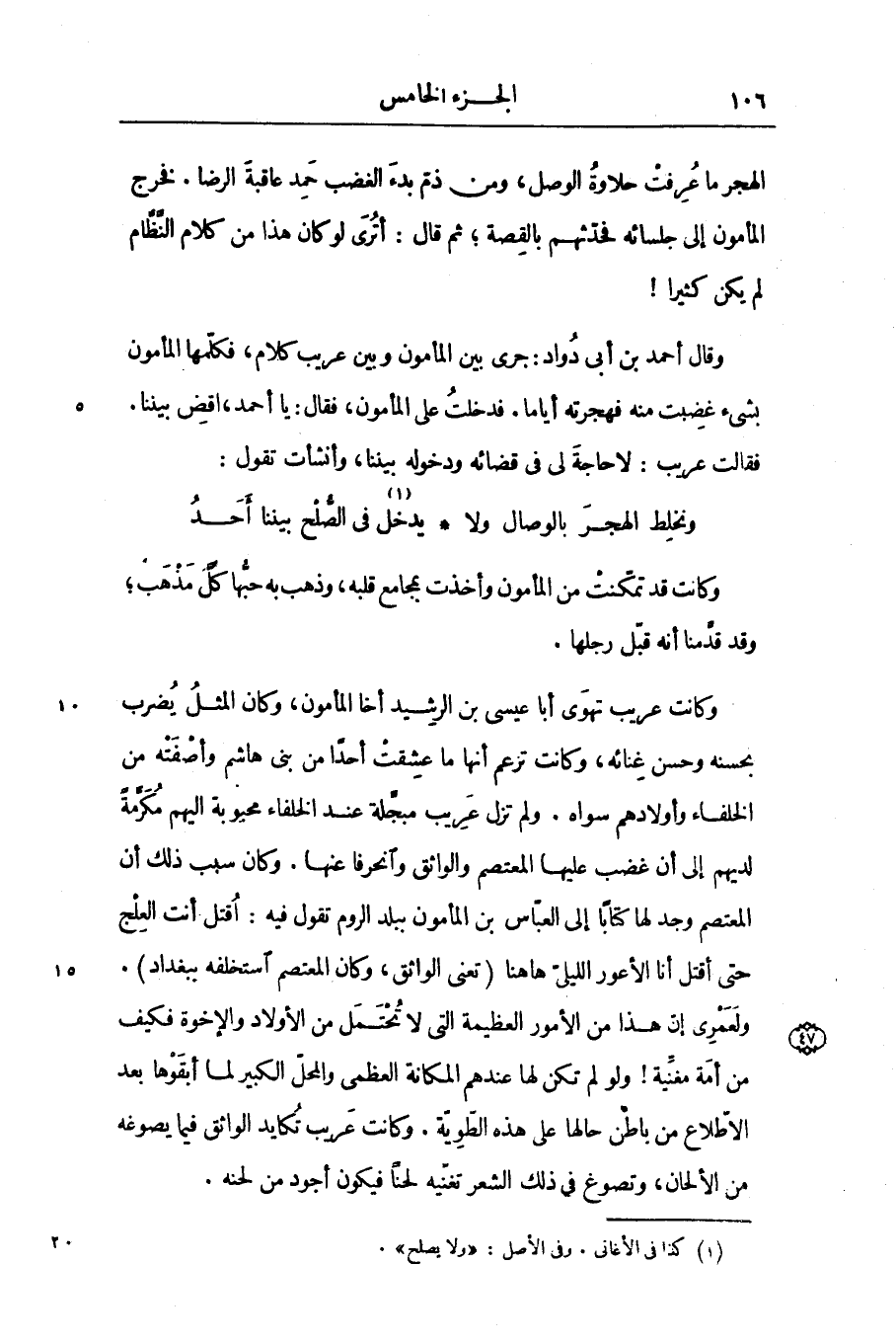 الهجر ما عرفت حلاوة الوصل، ومن ذمّ بدء الغضب حمد عاقبة الرضا. فخرج المأمون إلى جلسائه فحدّثهم بالقصة؛ ثم قال: أترى لو كان هذا من كلام النّظام لم يكن كثيرا! وقال أحمد بن أبى دواد: جرى بين المأمون وبين عريب كلام، فكلّمها المأمون بشىء غضبت منه فهجرته أياما. فدخلت على المأمون، فقال: يا أحمد، اقض بيننا.