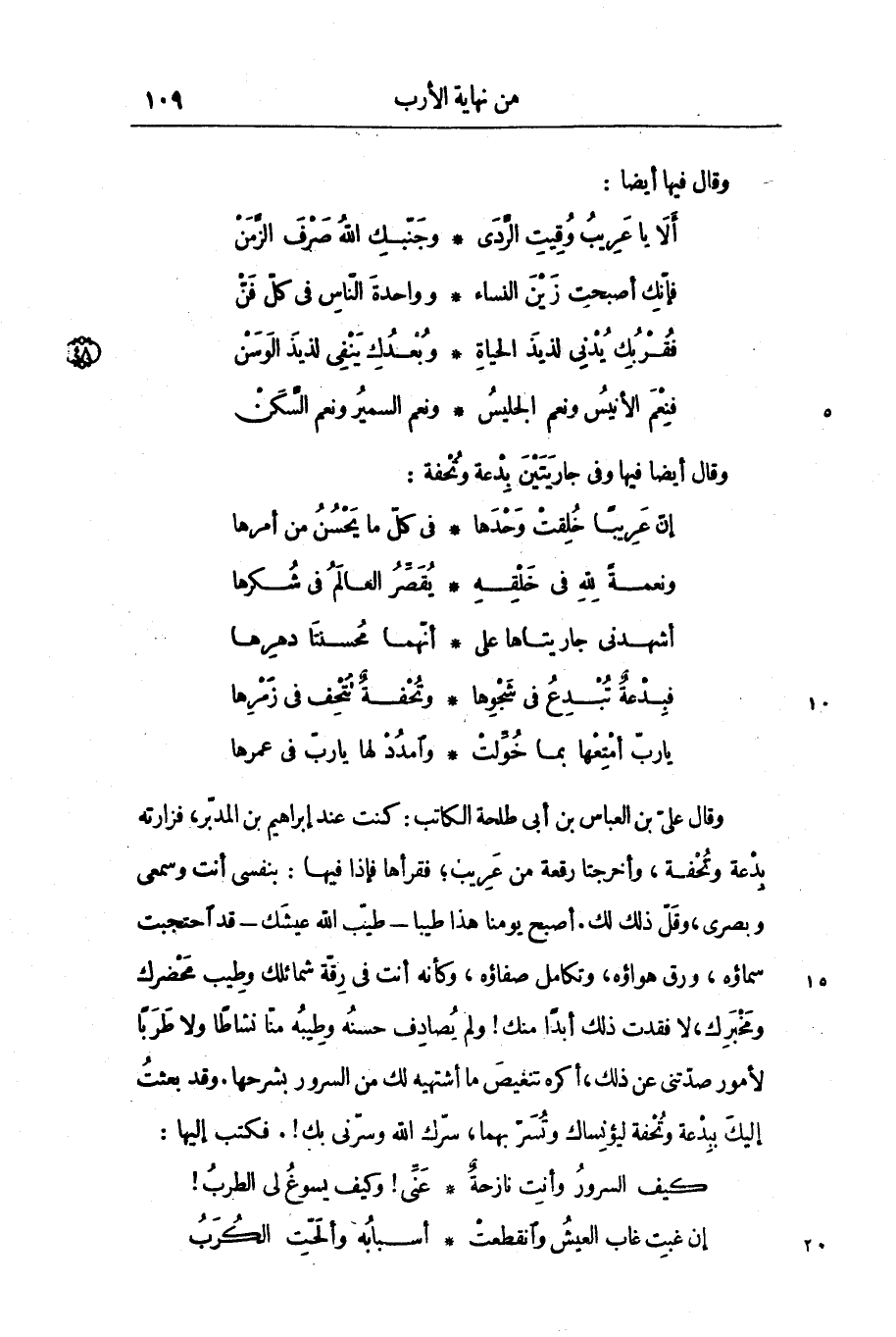 وقال علىّ بن العباس بن أبى طلحة الكاتب: كنت عند إبراهيم بن المدبّر، فزارته بدعة وتحفة، وأخرجتا رقعة من عريب؛ فقرأها فإذا فيها: بنفسى أنت وسمعى وبصرى، وقلّ ذلك لك. أصبح يومنا هذا طيبا- طيّب الله عيشك- قد احتجبت سماؤه، ورق هواؤه، وتكامل صفاؤه، وكأنه أنت فى رقّة شمائلك وطيب محضرك ومخبرك، لا فقدت ذلك أبدا منك! ولم يصادف حسنه وطيبه منّا نشاطا ولا طربا لأمور صدّتنى عن ذلك، أكره تنغيص ما أشتهيه لك من السرور بشرحها. وقد بعثت إليك ببدعة وتحفة ليؤنساك وتسرّ بهما، سرّك الله وسرّنى بك!. فكتب إليها: