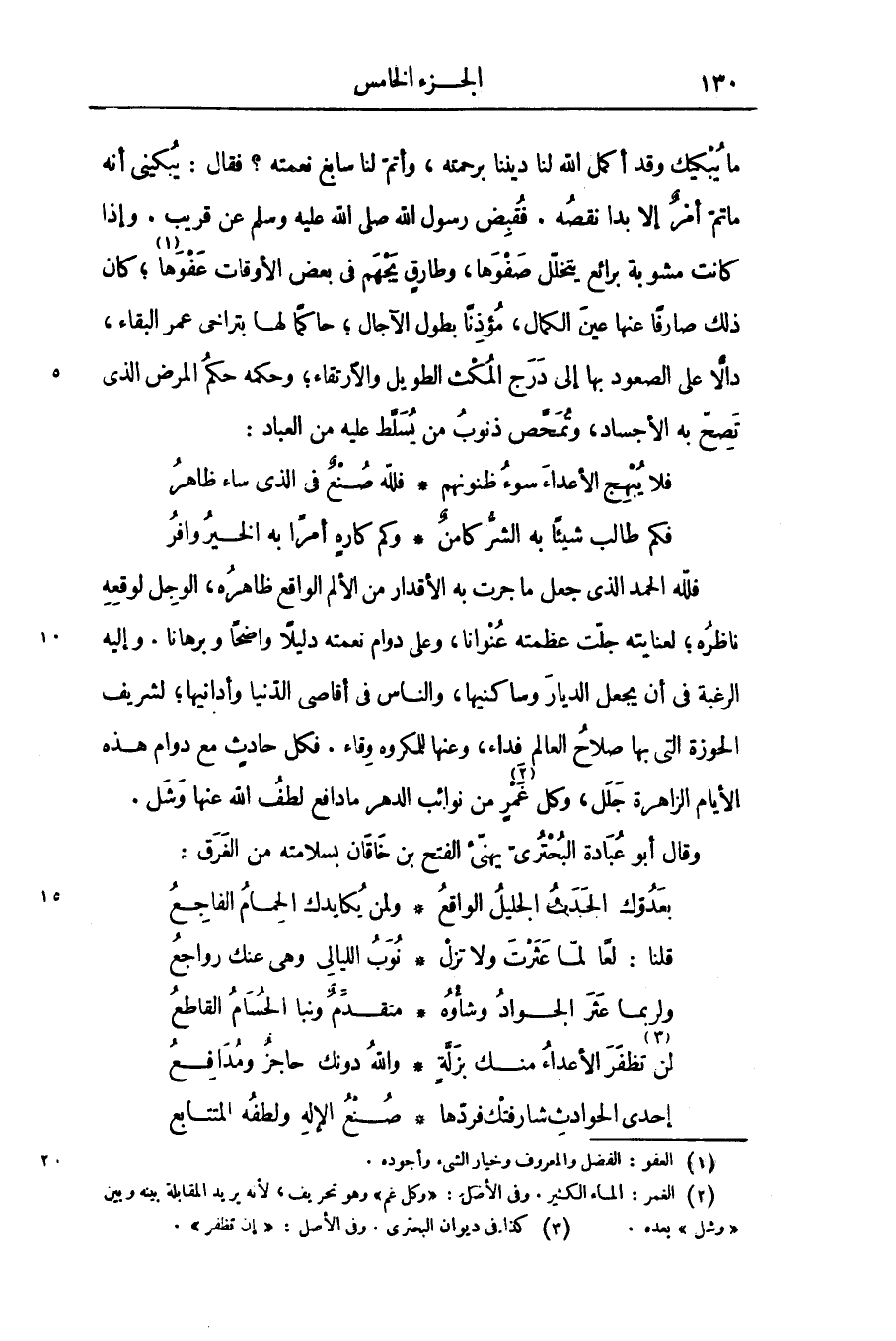 ما يبكيك وقد أكمل الله لنا ديننا برحمته، وأتمّ لنا سابغ نعمته؟ فقال: يبكينى أنه ماتم أمر إلا بدا نقصه. فقبض رسول الله صلى الله عليه وسلم عن قريب. وإذا كانت مشوبة برائع يتخلّل صفوها، وطارق يجهم فى بعض الأوقات عفوها [1] ؛ كان ذلك صارفا عنها عين الكمال، مؤذنا بطول الآجال؛ حاكما لها بتراخى عمر البقاء، دالّا على الصعود بها إلى درج المكث الطويل والارتقاء؛ وحكمه حكم المرض الذى تصحّ به الأجساد، وتمحّص ذنوب من يسلّط عليه من العباد: