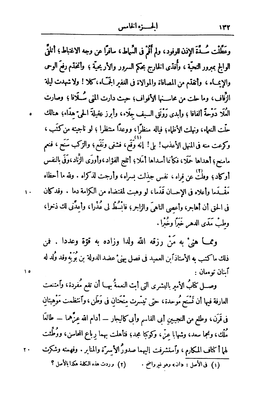 وصل كتاب الأمير بالبشرى التى أبت النعمة بها أن تقع مفردة، وامتنعت العارفة فيها أن تسنح موحدة، حتى تيسّرت منحتان فى وطن، وانتظمت موهبتان فى قرن، وطلع من النجيبين أبى القاسم وأبى كاليجار- أدام الله عزّهما- طالعا ملك، ونجما سعد، وشهابا عزّ، وكوكبا مجد؛ فتأهلت بهما رباع المحاسن، ووطّئت لهما أكناف المكارم، واستشرفت إليهما صدور الأسرّة والمنابر. وفهمته وشكرت