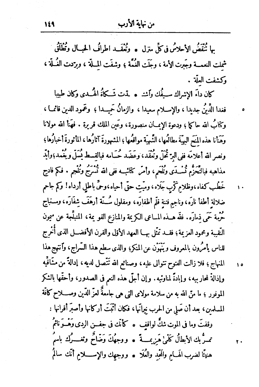 فغدا الدّين جديدا، والإسلام سعيدا، والزمان حميدا؛ وعمود الدين قائما، وكتاب الله حاكما؛ ودعوة الإيمان منصورة، وعين الملك قريرة. فهنأ الله مولانا وهنأنا هذه المنح البهيّة مطالعها، الشّهيّة مواقعها؛ المشهورة آثارها، المأثورة أخبارها؛ ونصر الله أعلامه ففى البرّ تحلّ وتعقد، وعضد حسامه فبالقسط يسلّ ويغمد؛ وأيّد مذاهبه فبالتّحزّم تسدى وتلحم، وأمّر كتائبه ففى الله تسرج وتلجم. فكم فادح خطب كفاه، وظلام كرب جلاه، وميّت حقّ أحياه، وحىّ باطل أرداه! وكم جاحم ضلالة أطفأ ناره، وناجم فتنة قلّم أظفاره، ومفلول سنّة أرهف شفاره، ومستباح حرمة حمى ذماره. فلله هذه المساعى الكريمة والمنازع القويمة، المتبلّجة عن ميمون النّقيبة ومحمود العزيمة؛ فقد تمثّل بها العهد الأوّل والقرن الأفضل الذى أخرج للناس يأمرون بالمعروف وينهون عن المنكر؛ والذى سطع هذا السّراج، وانتهج هذا المنهاج؛ فلا زالت الفتوح تتوالى عليه، وصنائع الله تتّصل لديه، إدالة من مشاقّيه وإذالة لمحاربيه، وإبادة لمناوئيه. وإن أجلّ هذه النعم فى الصدور، وأحقّها بالشكر الموفور؛ ما منّ الله به من سلامة مولاى التى هى جامعة لعزّ الدّين وصلاح كافّة المسلمين، بعد أن صلى من الحرب نيرانها، فكان أثّبت أركانها وأصبر أقرانها: