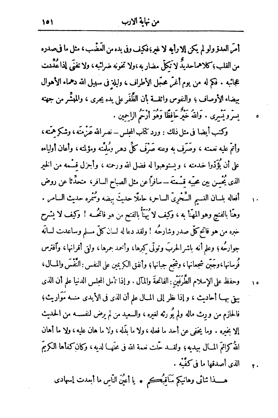 وهنّأ بالفتح وهو المهّنأ به، وكيف لا يهنّأ بالفتح من هو فاتحه! وكيف لا يشرح خبره من هو فاتح كلّ صدر وشارحه! ولقد دعا له لسان كلّ مسلم وساعدت لسانه جوارحه؛ وعلم أنه باشر الحرب وتولّى كبرها، وأخمد جمرها، ولقى أقرانها، وافترس فرسانها، وجبّن شجعانها، وشجّع جبانها؛ وأنفق الكريمين على النفس: النّفس والمال، وحفظ على الإسلام الطّرفين: الفاتحة والمآل. وإذا تأمل المجلس الدنيا علم أن الذى يبقى بها أحاديث، وإذا نظر إلى المال علم أن الذى فى الأيدى منه مواريث؛ فالحازم من ورث ماله ولم يورثه لغيره، والسعيد من لم يرض لنفسه من الحديث إلا بخيره. وما يخفى عن أحد ما فعله، ولا ما بذله، ولا ما هان عليه، ولا ما أهان الله كرائم المال بيديه؛ ولقد حلّت نعمة الله فى محلّها لديه، وكان كفأها الكريم الذى أصدقها ما فى كفّيه.
