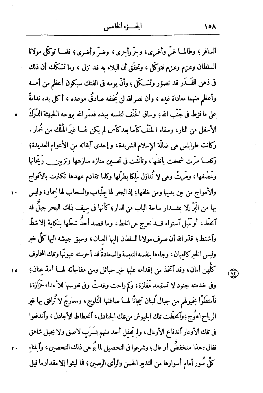 وكانت طرابلس هى ضالّة الإسلام الشريدة، وإحدى آبقاته من الأعوام العديدة؛ وكلما مرّت شمخت بأنفها، وتأنّقت فى تحسين منازه منازهها وتزيين ريحانها وعصفها، ومرّت وهى لا تغازل ملكا بطرفها وكلما تقادم عهدها تكثرت بالأفواج والأمواج من بين يديها ومن خلفها؛ إذ البحر لها جلباب والسحاب لها خمار، وليس بها من البرّ إلا بمقدار ساحة الباب من الدار؛ كأنها فى سيف ذلك البحر جبل قد انحطّ، أو ميل استواء قد خرج عن الخط، وما قصد أحد شطّها بنكاية إلا شطّ واشتط؛ قدّر الله أن صرف مولانا السلطان إليها العنان، وسبق جيشه اليها كلّ خبر وليس الخبر كالعيان، وجاءها بنفسه النفيسة والسعادة قد أحرسته عيونها وتلك المخاوف كلّهن أمان، وقد اتخذ من إقدامه عليها خير حبائل ومن مفاجأته لها أمدّ عنان؛ وفى خدمته جنود لا تستبعد مفازة، وكم راحت وغدت وفى نفوسها للأعداء حزازة؛ فامتطوا بخيولهم من جبال لبنان تيجانا لها صاغتها الثّلوج، ومعارج لا ترافق بها غير الرياح الهوج؛ وانحطّت تلك الجيوش من تلك الجنادل، انحطاط الأجادل، واندفعوا فى تلك الأوعار اندفاع الأوعال، ولم يحفل أحد منهم بسرب لاصق ولا بجبل شاهق فقال: هذا منخفض أو عال؛ وشرعوا فى التحصيل لما يوهى ذلك التحصين، وابتناء كلّ سور أمام أسوارها من التدبير الحسن والرأى الرصين؛ فما لبثوا إلا مقدار ما قيل