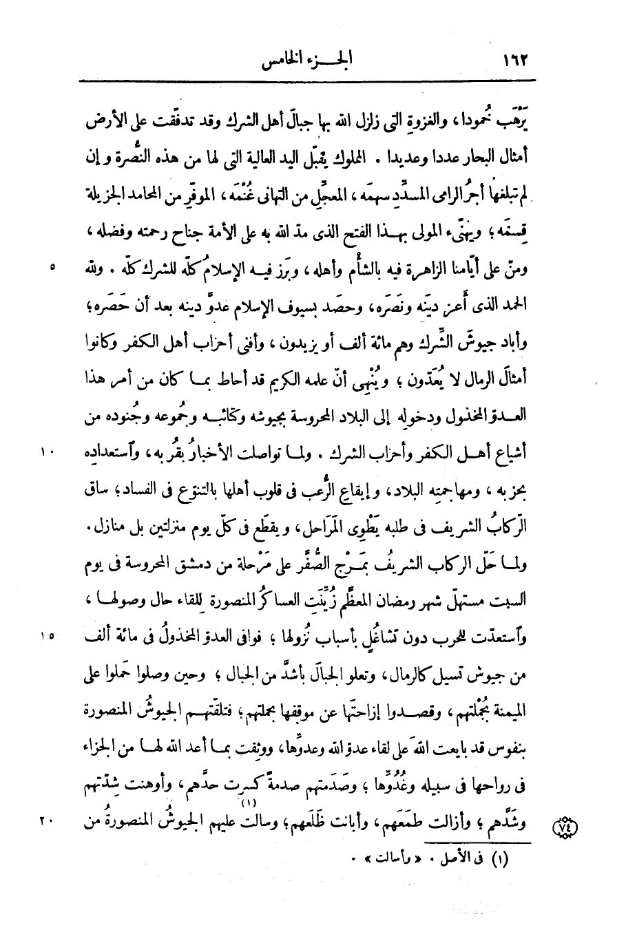 يرهب خمودا، والغزوة التى زلزل الله بها جبال أهل الشرك وقد تدفّقت على الأرض أمثال البحار عددا وعديدا. المملوك يقبّل اليد العالية التى لها من هذه النّصرة وإن لم تبلغها أجر الرامى المسدّد سهمه، المعجّل من التهانى غنمه، الموفّر من المحامد الجزيلة قسمه؛ ويهنّىء المولى بهذا الفتح الذى مدّ الله به على الأمة جناح رحمته وفضله، ومنّ على أيّامنا الزاهرة فيه بالشأم وأهله، وبرز فيه الإسلام كلّه للشرك كلّه. ولله الحمد الذى أعز دينه ونصره، وحصد بسيوف الإسلام عدوّ دينه بعد أن حصره؛ وأباد جيوش الشّرك وهم مائة ألف أو يزيدون، وأفنى أحزاب أهل الكفر وكانوا أمثال الرمال لا يعدّون؛ وينهى أنّ علمه الكريم قد أحاط بما كان من أمر هذا العدوّ المخذول ودخوله إلى البلاد المحروسة بجيوشه وكتائبه وجموعه وجنوده من أشياع أهل الكفر وأحزاب الشرك. ولما تواصلت الأخبار بقربه، واستعداده بحزبه، ومهاجمته البلاد، وإيقاع الرّعب فى قلوب أهلها بالتنوّع فى الفساد؛ ساق الرّكاب الشريف فى طلبه يطوى المراحل، ويقطع فى كلّ يوم منزلتين بل منازل.