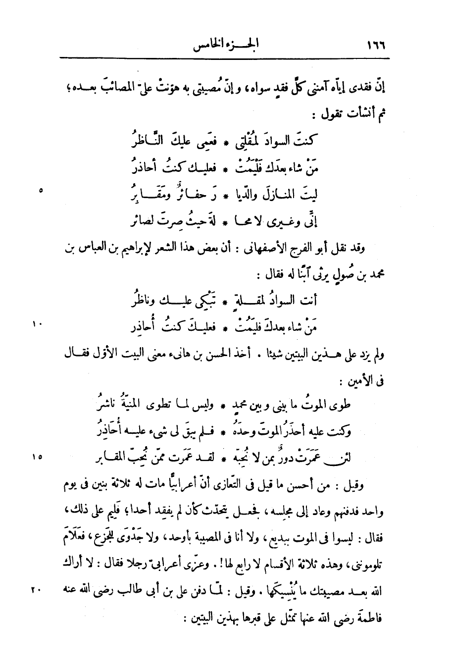 وقد نقل أبو الفرج الأصفهانى: أن بعض هذا الشعر لإبراهيم بن العباس بن محمد بن صول يرثى ابنا له فقال: