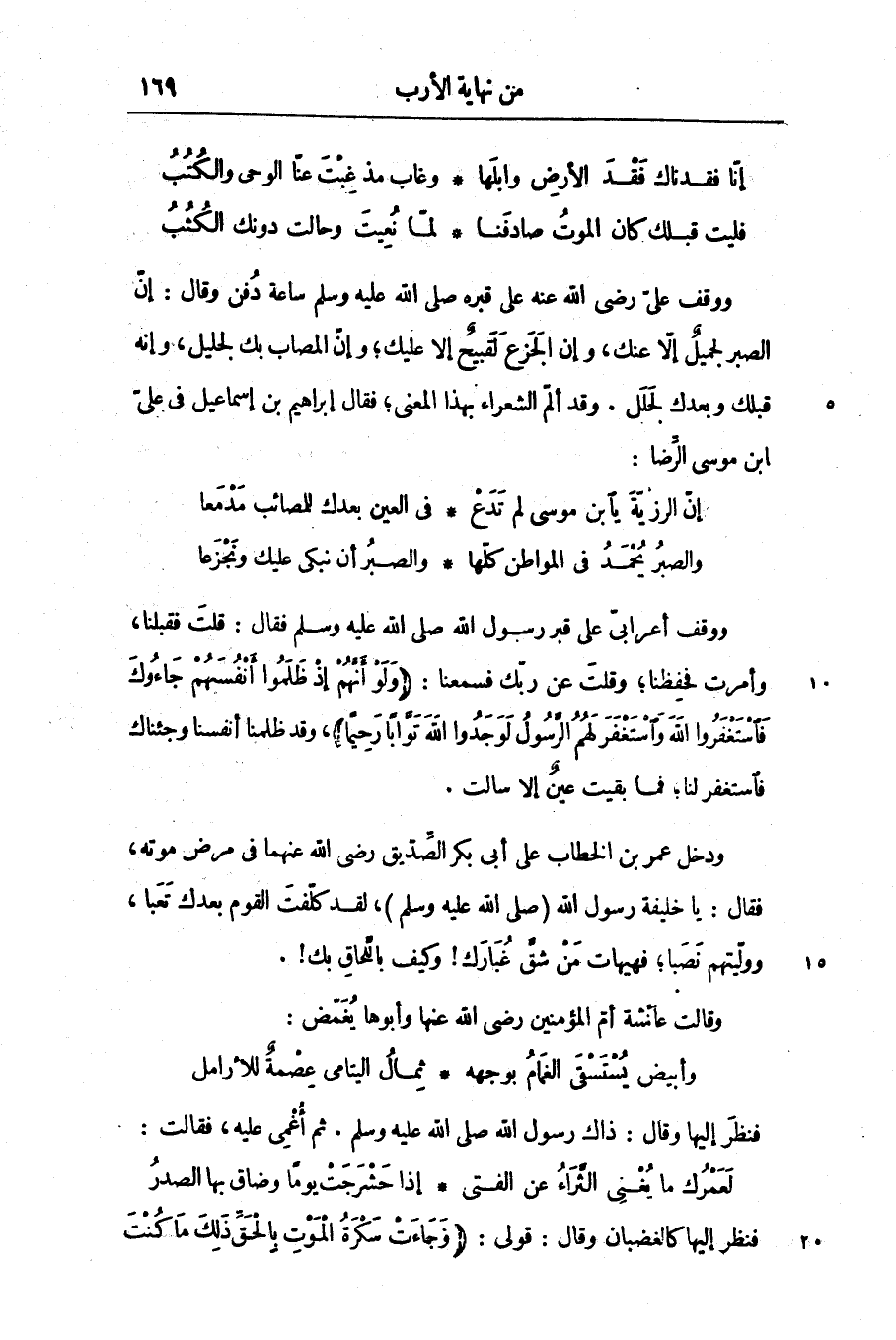 ووقف علىّ رضى الله عنه على قبره صلى الله عليه وسلم ساعة دفن وقال: إنّ الصبر لجميل إلّا عنك، وإن الجزع لقبيح إلا عليك؛ وإنّ المصاب بك لجليل، وإنه قبلك وبعدك لجلل. وقد ألّم الشعراء بهذا المعنى؛ فقال إبراهيم بن إسماعيل فى علىّ ابن موسى الرّضا: