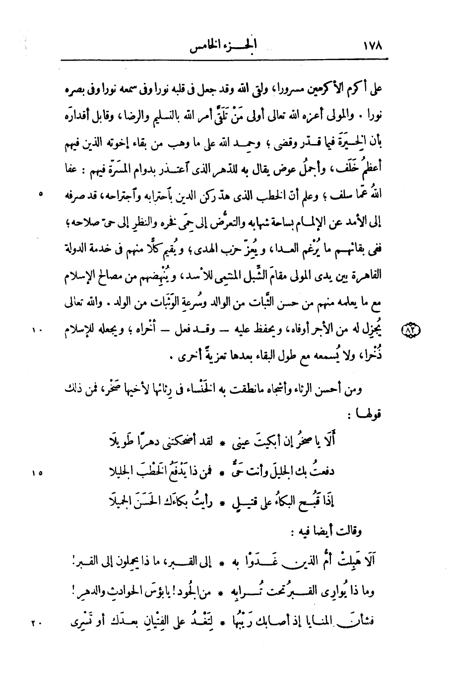 على أكرم الأكرمين مسرورا، ولقى الله وقد جعل فى قلبه نورا وفى سمعه نورا وفى بصره نورا. والمولى أعزه الله تعالى أولى من تلقّى أمر الله بالتسليم والرضا، وقابل أقداره بأن الخيرة فيما قدّر وقضى؛ وحمد الله على ما وهب من بقاء إخوته الذين فيهم أعظم خلف، وأجمل عوض يقال به للدّهر الذى اعتذر بدوام المسرّة فيهم: عفا الله عمّا سلف؛ وعلم أنّ الخطب الذى هدّ ركن الدين باحترابه واجتراحه، قد صرفه إلى الأمد عن الإلمام بساحة شهابه والتعرّض إلى حمى فخره والنظر إلى حىّ صلاحه؛ ففى بقائهم ما يرغم العدا، ويعزّ حزب الهدى؛ ويقيم كلّا منهم فى خدمة الدولة القاهرة بين يدى المولى مقام الشّبل المنتمى للأسد، وينهضهم من مصالح الإسلام مع ما يعلمه منهم من حسن الثّبات من الوالد وسرعة الوثبات من الولد. والله تعالى يجزل له من الأجر أوفاه، ويحفظ عليه- وقد فعل- أخراه؛ ويجعله للإسلام ذخرا، ولا يسمعه مع طول البقاء بعدها تعزية أخرى.