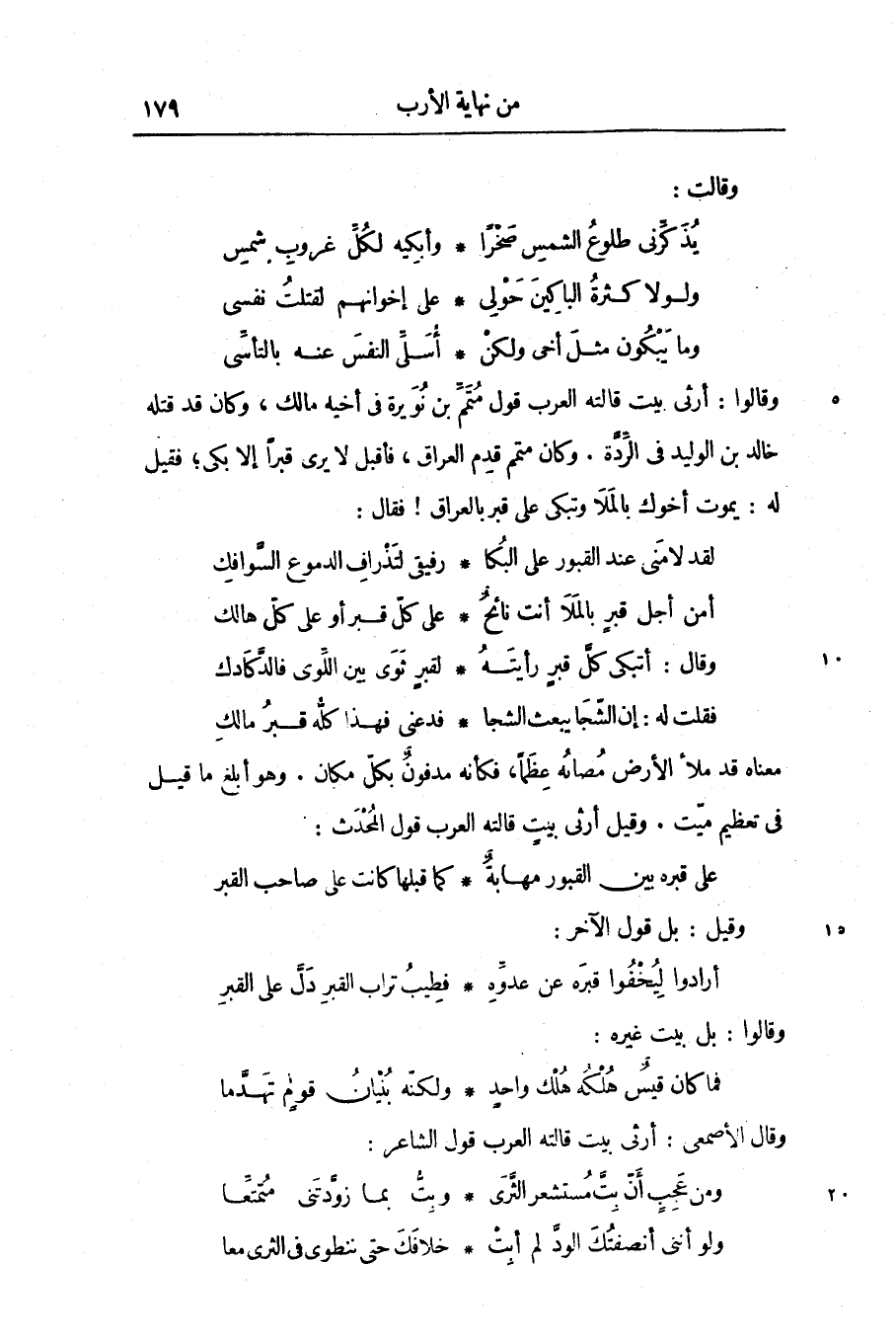 وقالوا: أرثى بيت قالته العرب قول متمّم بن نويرة فى أخيه مالك، وكان قد قتله خالد بن الوليد فى الرّدّة. وكان متمم قدم العراق، فأقبل لا يرى قبرا إلا بكى؛ فقيل له: يموت أخوك بالملا وتبكى على قبر بالعراق! فقال: