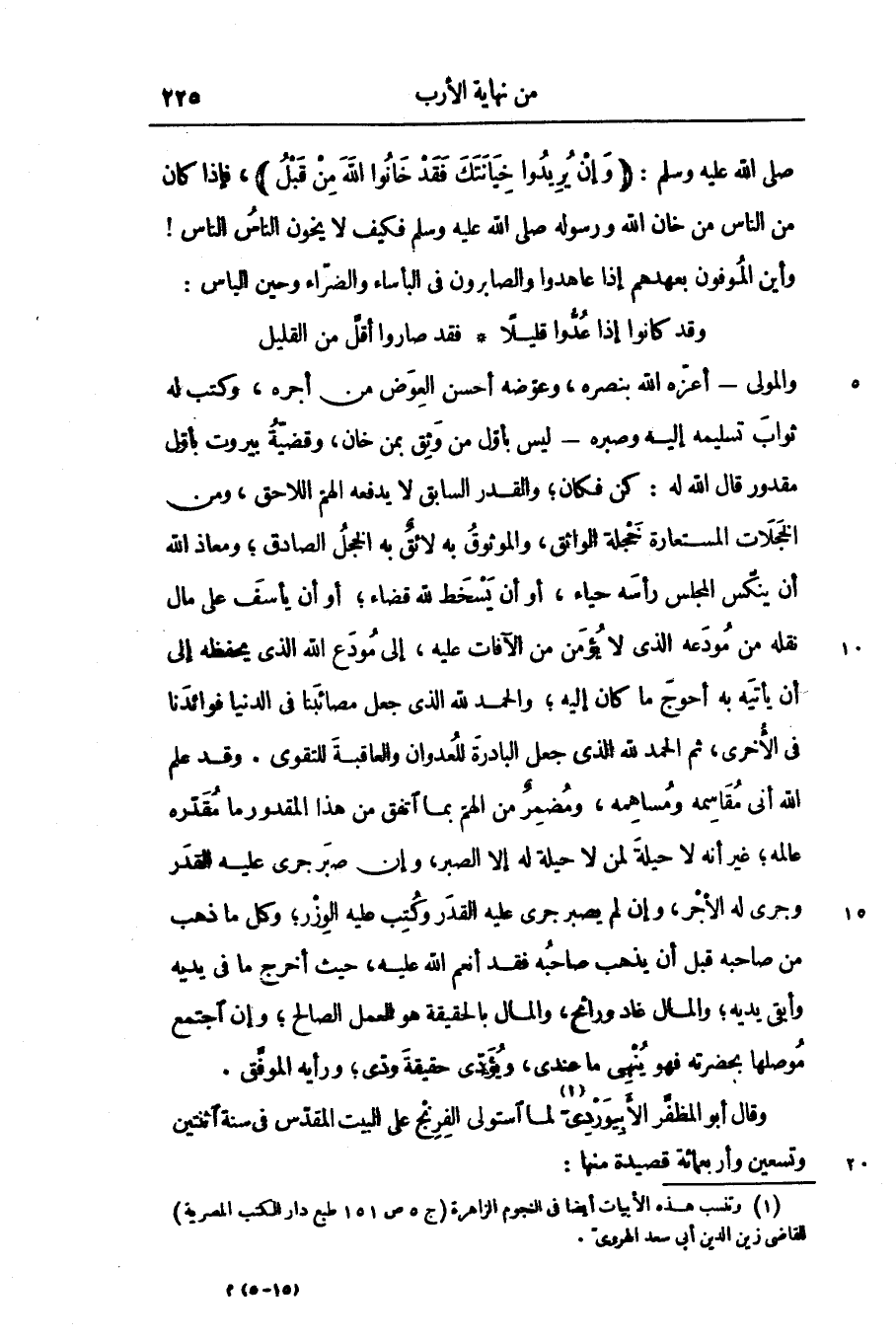 والمولى- أعزّه الله بنصره، وعوّضه أحسن العوض من أجره، وكتب له ثواب تسليمه إليه وصبره- ليس بأوّل من وثق بمن خان، وقضيّة بيروت بأوّل مقدور قال الله له: كن فكان؛ والقدر السابق لا يدفعه الهمّ اللاحق، ومن الخجلات المستعارة خجلة الواثق، والموثوق به لائق به الخجل الصادق؛ ومعاذ الله أن ينكس المجلس رأسه حياء، أو أن يسخط لله قضاء؛ أو أن يأسف على مال نقله من مودعه الذى لا يؤمن من الآفات عليه، إلى مودع الله الذى يحفظه إلى أن يأتيه به أحوج ما كان إليه؛ والحمد لله الذى جعل مصائبنا فى الدنيا فوائدنا فى الأخرى، ثم الحمد لله الذى جعل البادرة للعدوان والعاقبة للتقوى. وقد علم الله أنى مقاسمه ومساهمه، ومضمر من الهمّ بما اتفق من هذا المقدور ما مقدّره عالمه؛ غير أنه لا حيلة لمن لا حيلة له إلا الصبر، وإن صبر جرى عليه القدر وجرى له الأجر، وإن لم يصبر جرى عليه القدر وكتب عليه الوزر؛ وكل ما ذهب من صاحبه قبل أن يذهب صاحبه فقد أنعم الله عليه، حيث أخرج ما فى يديه وأبقى يديه؛ والمال غاد ورائح، والمال بالحقيقة هو العمل الصالح؛ وإن اجتمع موصلها بحضرته فهو ينهى ما عندى، ويؤدّى حقيقة ودّى؛ ورأية الموفّق.