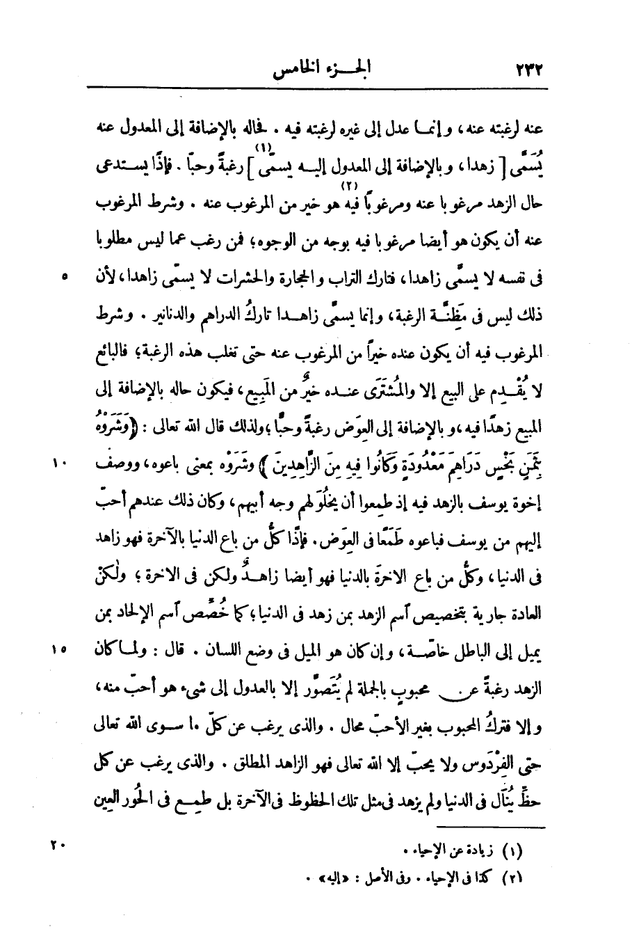 عنه لرغبته عنه، وإنما عدل إلى غيره لرغبته فيه. فحاله بالإضافة إلى المعدول عنه يسمّى [زهدا، وبالإضافة إلى المعدول إليه يسمّى [1]] رغبة وحبّا. فإذا يستدعى حال الزهد مرغوبا عنه ومرغوبا فيه [2] هو خير من المرغوب عنه. وشرط المرغوب عنه أن يكون هو أيضا مرغوبا فيه بوجه من الوجوه؛ فمن رغب عما ليس مطلوبا فى نفسه لا يسمّى زاهدا، فتارك التراب والحجارة والحشرات لا يسمّى زاهدا، لأن ذلك ليس فى مظنّة الرغبة، وإنما يسمّى زاهدا تارك الدراهم والدنانير. وشرط المرغوب فيه أن يكون عنده خيرا من المرغوب عنه حتى تغلب هذه الرغبة؛ فالبائع لا يقدم على البيع إلا والمشترى عنده خير من المبيع، فيكون حاله بالإضافة إلى المبيع زهدا فيه، وبالإضافة إلى العوض رغبة وحبّا؛ ولذلك قال الله تعالى: وَشَرَوْهُ بِثَمَنٍ بَخْسٍ دَراهِمَ مَعْدُودَةٍ وَكانُوا فِيهِ مِنَ الزَّاهِدِينَ