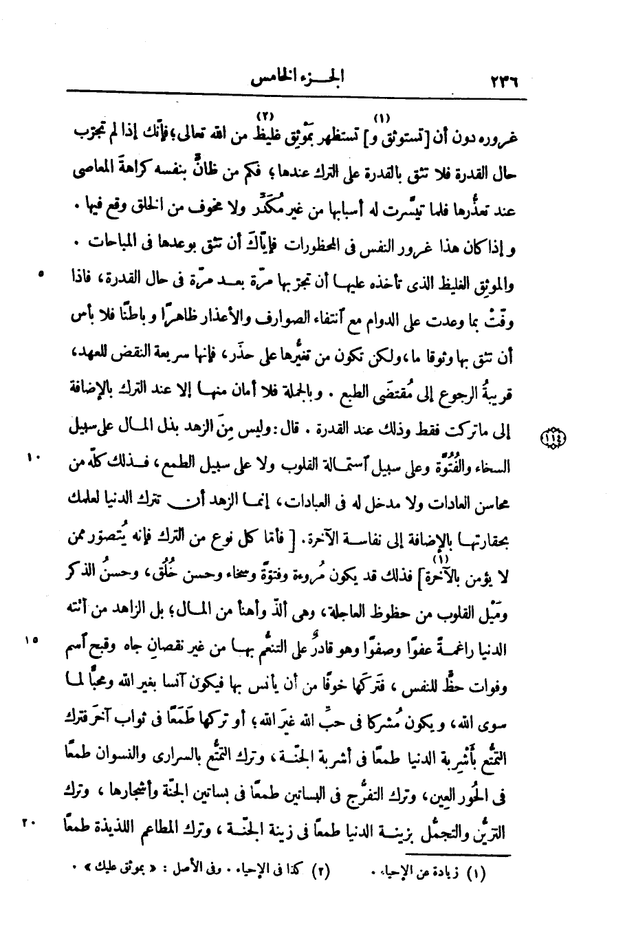 والموثق الغليظ الذى تأخذه عليها أن تجرّبها مرّة بعد مرّة فى حال القدرة، فاذا وفّت بما وعدت على الدوام مع انتفاء الصوارف والأعذار ظاهرا وباطنا فلا بأس أن تثق بها وثوقا ما، ولكن تكون من تغيّرها على حذر، فإنها سريعة النقض للعهد، قريبة الرجوع إلى مقتضى الطبع. وبالجملة فلا أمان منها إلا عند الترك بالإضافة إلى ما تركت فقط وذلك عند القدرة. قال: وليس من الزهد بذل المال على سبيل السخاء والفتوّة وعلى سبيل استمالة القلوب ولا على سبيل الطمع، فذلك كلّه من محاسن العادات ولا مدخل له فى العبادات، إنما الزهد أن تترك الدنيا لعلمك بحقارتها بالإضافة إلى نفاسة الآخرة. [فأمّا كل نوع من الترك فإنه يتصوّر ممن لا يؤمن بالآخرة [1]] فذلك قد يكون مروءة وفتوّة وسخاء وحسن خلق، وحسن الذكر وميل القلوب من حظوظ العالجة، وهى ألذّ وأهنأ من المال؛ بل الزاهد من أتته الدنيا راغمة عفوا وصفوا وهو قادر على التنعّم بها من غير نقصان جاه وقبح اسم وفوات حظّ للنفس، فتركها خوفا من أن يأنس بها فيكون آنسا بغير الله ومحبّا لما سوى الله، ويكون مشركا فى حبّ الله غير الله؛ أو تركها طمعا فى ثواب آخر فترك التمتّع بأشربة الدنيا طمعا فى أشربة الجنّة، وترك التمتّع بالسرارى والنسوان طمعا فى الحور العين، وترك التفرّج فى البساتين طمعا فى بساتين الجنّة وأشجارها، وترك التزيّن والتجمّل بزينة الدنيا طمعا فى زينة الجنّة، وترك المطاعم اللذيذة طمعا