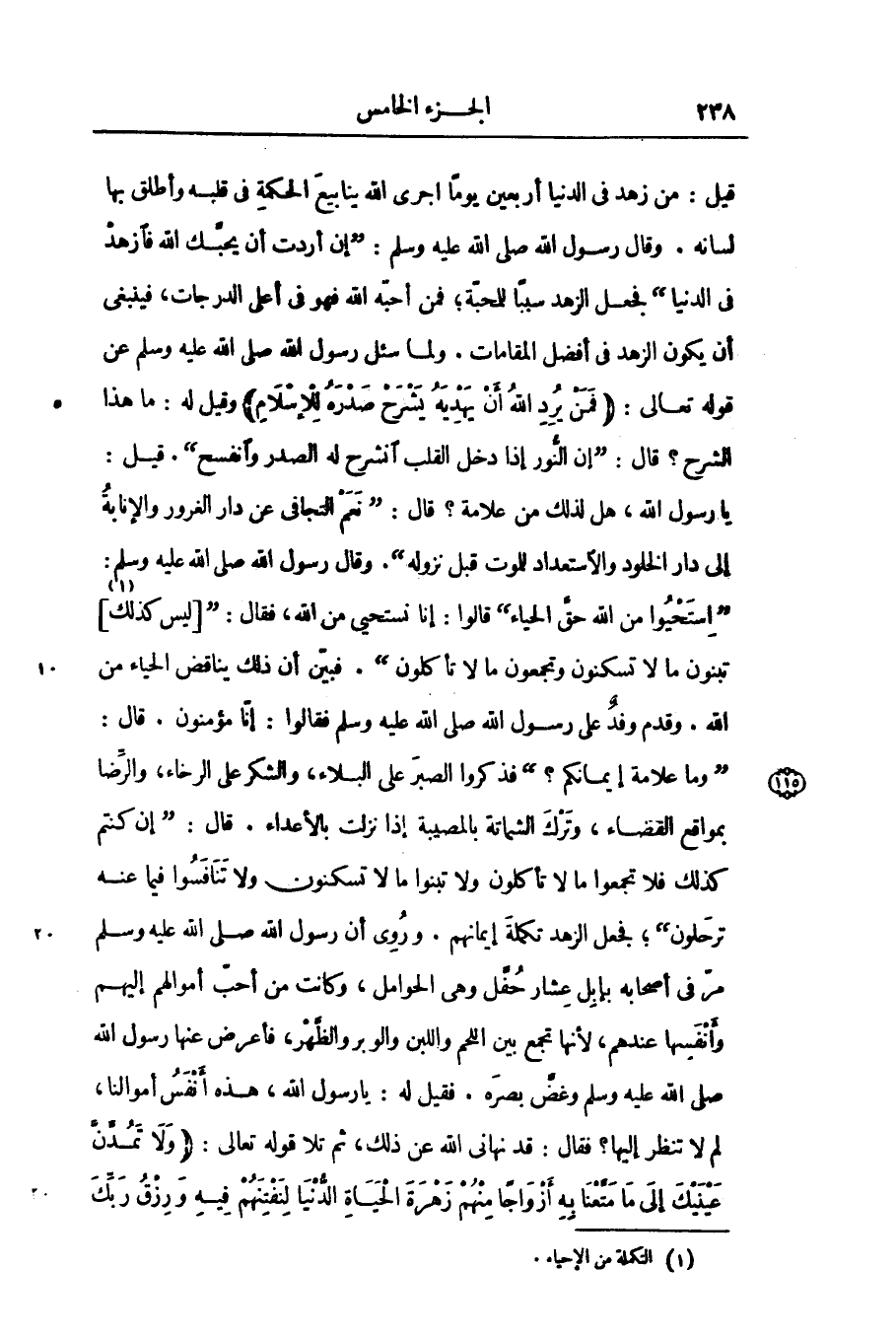 قيل: من زهد فى الدنيا أربعين يوما اجرى الله ينابيع الحكمة فى قلبه وأطلق بها لسانه.
