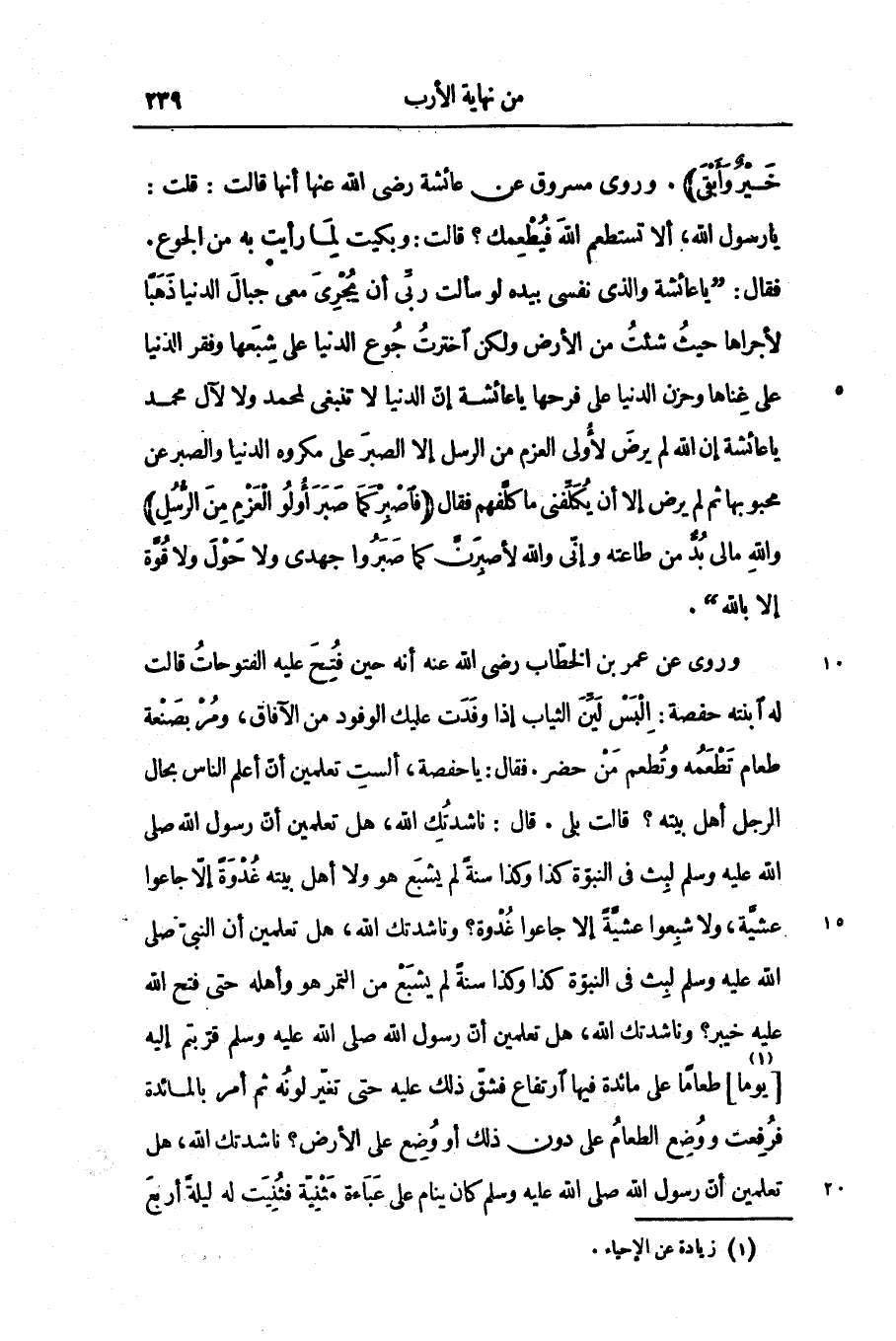 وروى عن عمر بن الخطّاب رضى الله عنه أنه حين فتح عليه الفتوحات قالت له ابنته حفصة: البس ليّن الثياب إذا وفدت عليك الوفود من الآفاق، ومر بصنعة طعام تطعمه وتطعم من حضر. فقال: يا حفصة، ألست تعلمين أنّ أعلم الناس بحال الرجل أهل بيته؟ قالت بلى. قال: ناشدتك الله، هل تعلمين أنّ رسول الله صلى الله عليه وسلم لبث فى النبوّة كذا وكذا سنة لم يشبع هو ولا أهل بيته غدوة إلّا جاعوا عشيّة، ولا شبعوا عشيّة إلا جاعوا غدوة؟ وناشدتك الله، هل تعلمين أن النبىّ صلى الله عليه وسلم لبث فى النبوّة كذا وكذا سنة لم يشبع من التمر هو وأهله حتى فتح الله عليه خيبر؟ وناشدتك الله، هل تعلمين أنّ رسول الله صلى الله عليه وسلم قرّبتم إليه [يوما [1]] طعاما على مائدة فيها ارتفاع فشقّ ذلك عليه حتى تغيّر لونه ثم أمر بالمائدة فرفعت ووضع الطعام على دون ذلك أو وضع على الأرض؟ ناشدتك الله، هل تعلمين أنّ رسول الله صلى الله عليه وسلم كان ينام على عباءة مثنيّة فثنيت له ليلة أربع