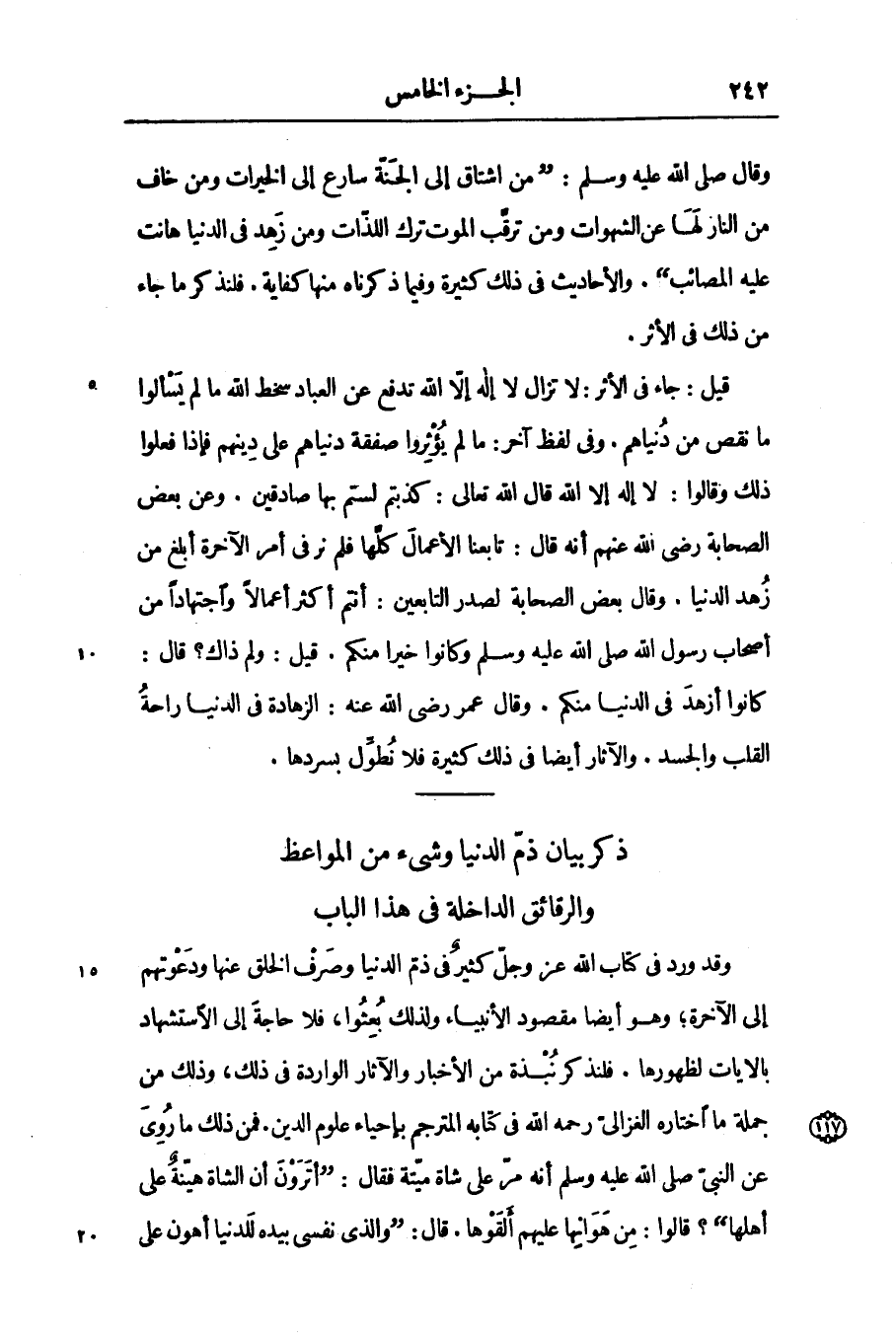 وقال صلى الله عليه وسلم: «من اشتاق إلى الجنّة سارع إلى الخيرات ومن خاف من النار لها عن الشهوات ومن ترقّب الموت ترك اللذّات ومن زهد فى الدنيا هانت عليه المصائب»