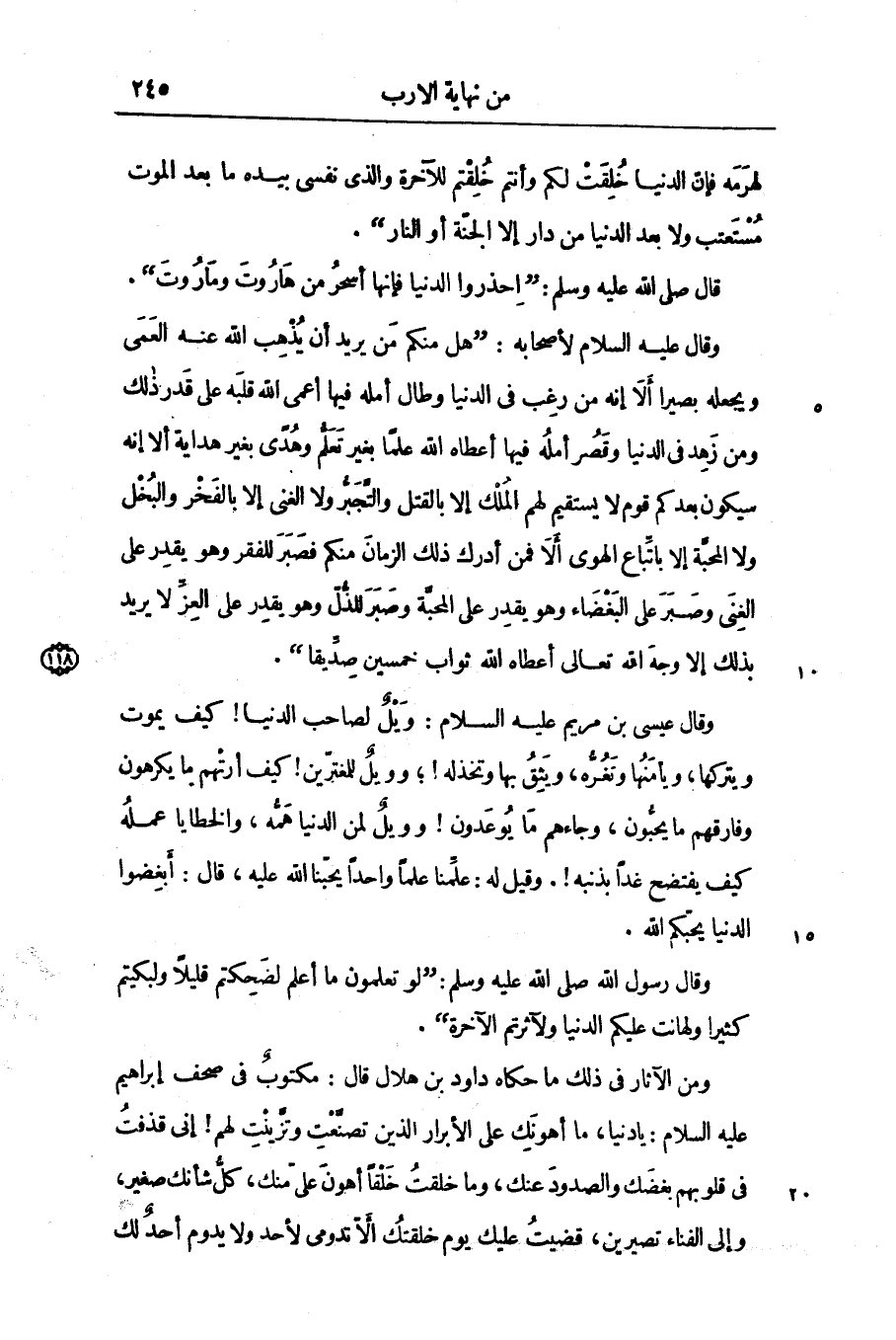 . ومن الآثار فى ذلك ما حكاه داود بن هلال قال: مكتوب فى صحف إبراهيم عليه السلام: يا دنيا، ما أهونك على الأبرار الذين تصنّعت وتزّينت لهم! إنى قذفت فى قلوبهم بغضك والصدود عنك، وما خلقت خلقا أهون علىّ منك، كلّ شأنك صغير، وإلى الفناء تصيرين، قضيت عليك يوم خلقتك الّا تدومى لأحد ولا يدوم أحد لك