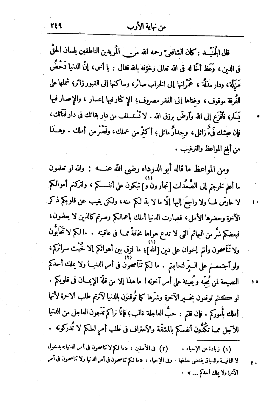 قال الجنيد: كان الشافعىّ رحمه الله من المريدين الناطقين بلسان الحقّ فى الدين، وعظ أخا له فى الله تعالى وخوّفه بالله فقال: يا أخى، إنّ الدنيا دحض مزلّة، ودار مذلّة، عمرانها إلى الخراب صائر، وساكنها إلى القبور زائر؛ شملها على الفرقة موقوف، وغتاها إلى الفقر مصروف؛ الإكثار فيها إعسار، والإعسار فيها يسار؛ فافزع إلى الله وارض برزق الله. لا تستسلف من دار بقائك فى دار فنائك، فإن عيشك فىء زائل، وجدار مائل؛ أكثر من عملك، وقصّر من أملك. وهذا من أبلغ المواعظ والترغيب.
