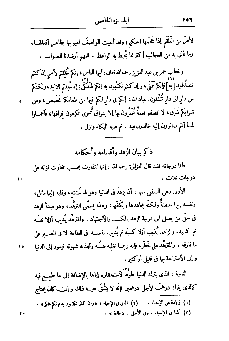 الأولى وهى السفلى منها: أن يزهد فى الدنيا وهو لها مشته، وقلبه إليها مائل، ونفسه إليها ملتفتة ولكنّه يجاهدها ويكفّها، وهذا يسمّى التزهّد، وهو مبدأ الزهد فى حقّ من يصل الى درجة الزهد بالكسب والاجتهاد. والمتزهّد يذيب أوّلا نفسه ثم كسبه، والزاهد يذيب أوّلا كسبه ثم يذيب نفسه فى الطاعة لا فى الصبر على ما فارقه. والمتزهّد على خطر، فإنه ربما تغلبه نفسه وتجذبه شهوته فيعود إلى الدنيا وإلى الاستراحة بها فى قليل أو كثير.