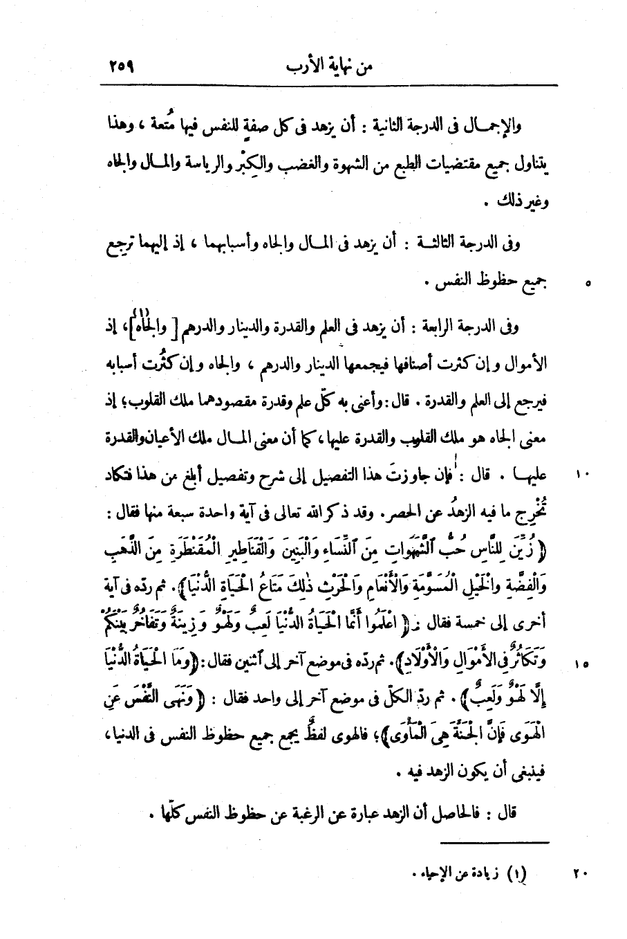 وفى الدرجة الرابعة: أن يزهد فى العلم والقدرة والدينار والدرهم [والجاه [1]] ، إذ الأموال وإن كثرت أصنافها فيجمعها الدينار والدرهم، والجاه وإن كثرت أسبابه فيرجع إلى العلم والقدرة. قال: وأعنى به كلّ علم وقدرة مقصودهما ملك القلوب؛ إذ معنى الجاه هو ملك القلوب والقدرة عليها، كما أن معنى المال ملك الأعيان والقدرة عليها. قال: فإن جاوزت هذا التفصيل إلى شرح وتفصيل أبلغ من هذا فتكاد تخرج ما فيه الزهد عن الحصر. وقد ذكر الله تعالى فى آية واحدة سبعة منها فقال: