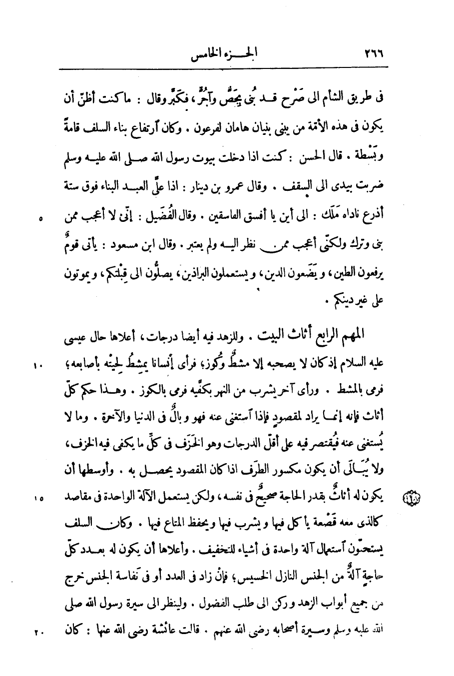 المهم الرابع أثاث البيت. وللزهد فيه أيضا درجات، أعلاها حال عيسى عليه السلام إذ كان لا يصحبه إلا مشط وكوز؛ فرأى إنسانا يمشط لحيته بأصابعه؛ فرمى بالمشط. ورأى آخر يشرب من النهر بكفّيه فرمى بالكوز. وهذا حكم كلّ أثاث فإنه إنما يراد لمقصود فإذا استغنى عنه فهو وبال فى الدنيا والآخرة. وما لا يستغنى عنه فيقتصر فيه على أقلّ الدرجات وهو الخزف فى كلّ ما يكفى فيه الخزف، ولا يبالى أن يكون مكسور الطرف اذا كان المقصود يحصل به. وأوسطها أن يكون له أثاث بقدر الحاجة صحيح فى نفسه، ولكن يستعمل الآلة الواحدة فى مقاصد كالذى معه قصعة يأكل فيها ويشرب فيها ويحفظ المتاع فيها. وكان السلف يستحبّون استعمال آلة واحدة فى أشياء للتخفيف. وأعلاها أن يكون له بعدد كلّ حاجة آلة من الجنس النازل الخسيس؛ فإن زاد فى العدد أو فى نفاسة الجنس خرج من جميع أبواب الزهد وركن الى طلب الفضول. ولينظر الى سيرة رسول الله صلى الله عليه وسلم وسيرة أصحابه رضى الله عنهم. قالت عائشة رضى الله عنها: كان
