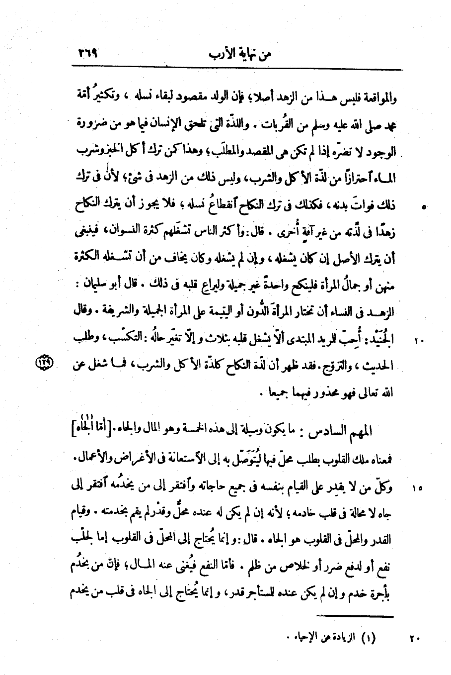المهم السادس: ما يكون وسيلة إلى هذه الخمسة وهو المال والجاه. [أمّا الجاه [1]] فمعناه ملك القلوب بطلب محلّ فيها ليتوصّل به إلى الاستعانة فى الأغراض والأعمال.
