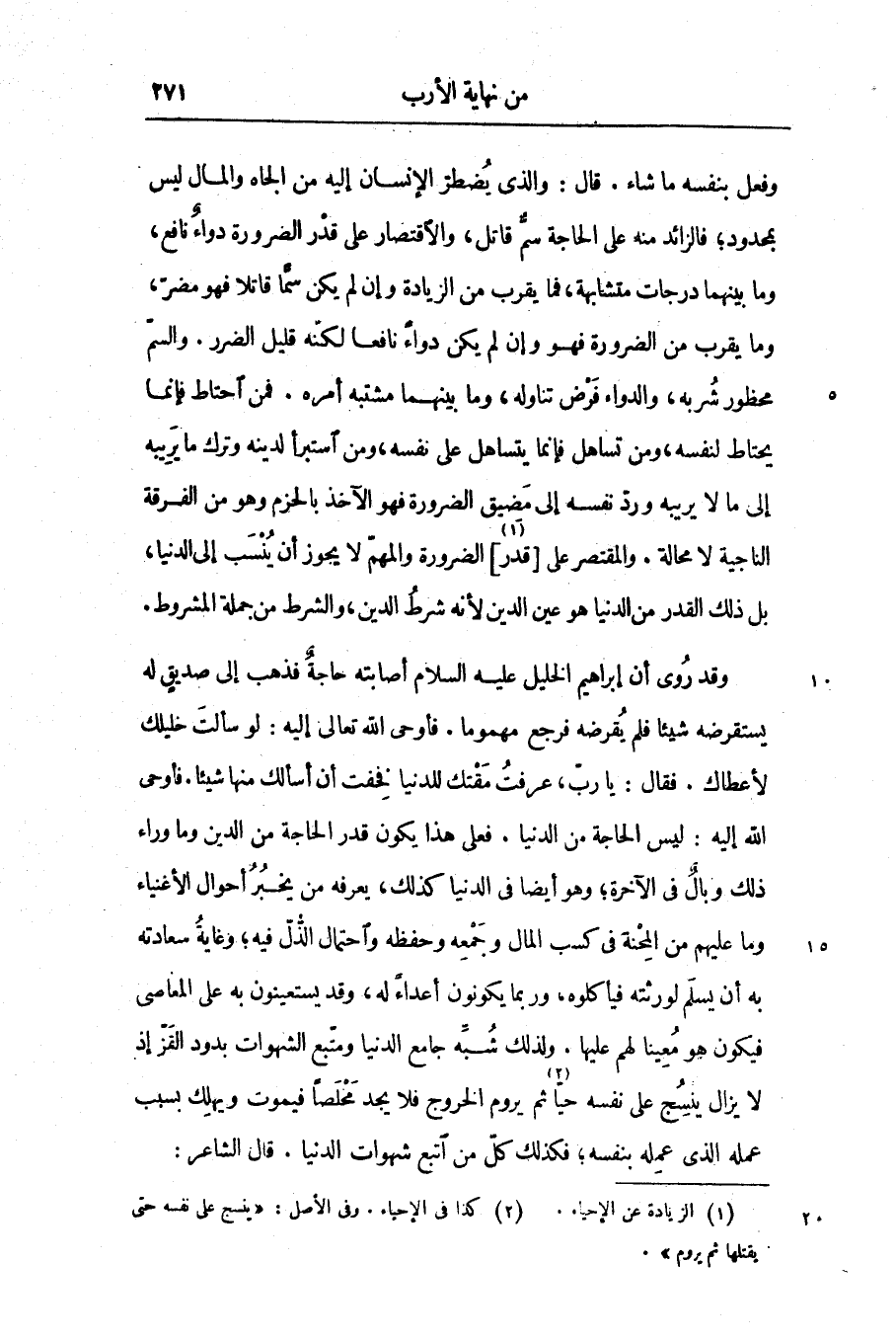وفعل بنفسه ما شاء. قال: والذى يضطرّ الإنسان إليه من الجاه والمال ليس بمحدود؛ فالزائد منه على الحاجة سمّ قاتل، والاقتصار على قدر الضرورة دواء نافع، وما بينهما درجات متشابهة، فما يقرب من الزيادة وإن لم يكن سمّا قاتلا فهو مضرّ، وما يقرب من الضرورة فهو وإن لم يكن دواء نافعا لكنّه قليل الضرر. والسمّ محظور شربه، والدواء فرض تناوله، وما بينهما مشتبه أمره. فمن احتاط فإنما يحتاط لنفسه، ومن تساهل فإنما يتساهل على نفسه، ومن استبرأ لدينه وترك ما يريبه إلى ما لا يريبه وردّ نفسه إلى مضيق الضرورة فهو الآخذ بالحزم وهو من الفرقة الناجية لا محالة. والمقتصر على [قدر [1]] الضرورة والمهمّ لا يجوز أن ينسب إلى الدنيا، بل ذلك القدر من الدنيا هو عين الدين لأنه شرط الدين، والشرط من جملة المشروط.