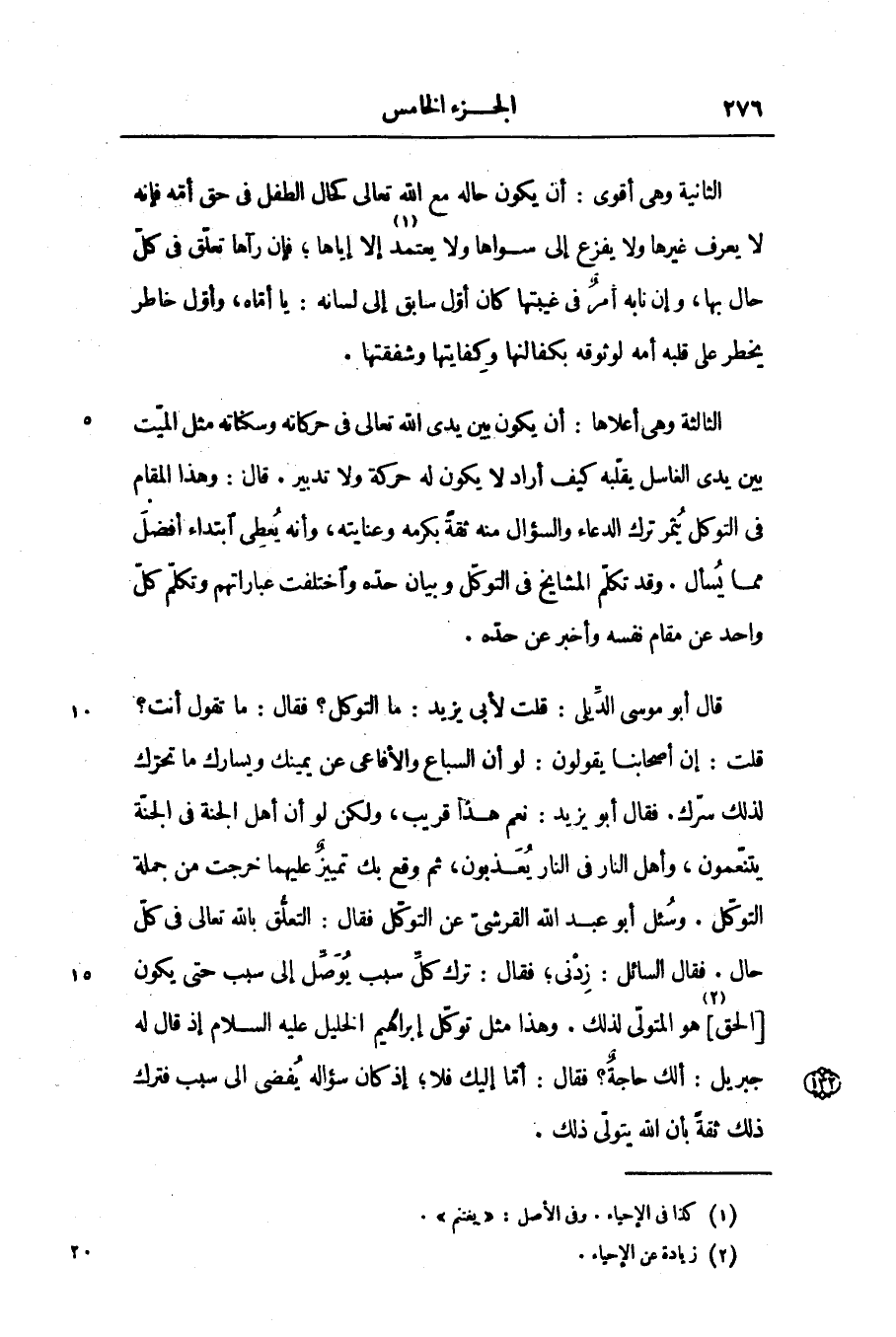 الثانية وهى أقوى: أن يكون حاله مع الله تعالى كحال الطفل فى حق أمّه فإنه لا يعرف غيرها ولا يفزع إلى سواها ولا يعتمد [1] إلا إياها؛ فإن رآها تعلّق فى كلّ حال بها، وإن نابه أمر فى غيبتها كان أوّل سابق إلى لسانه: يا أمّاه، وأوّل خاطر يخطر على قلبه أمه لوثوقه بكفالنها وكفايتها وشفقتها.