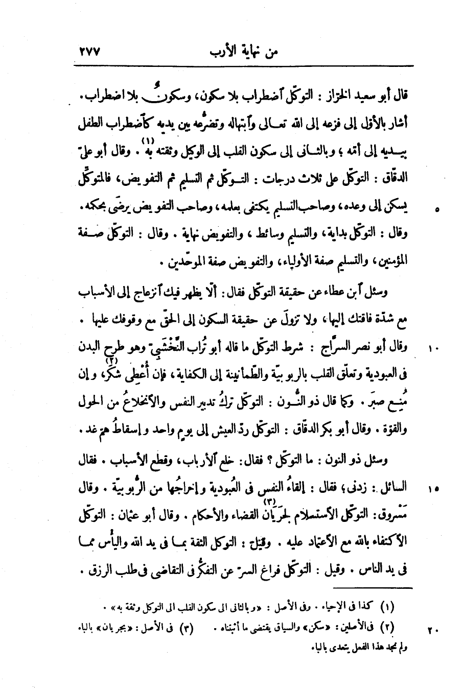 وقال: التوكّل بداية، والتسليم وسائط، والتفويض نهاية. وقال: التوكّل صفة المؤمنين، والتسليم صفة الأولياء، والتفويض صفة الموحّدين.