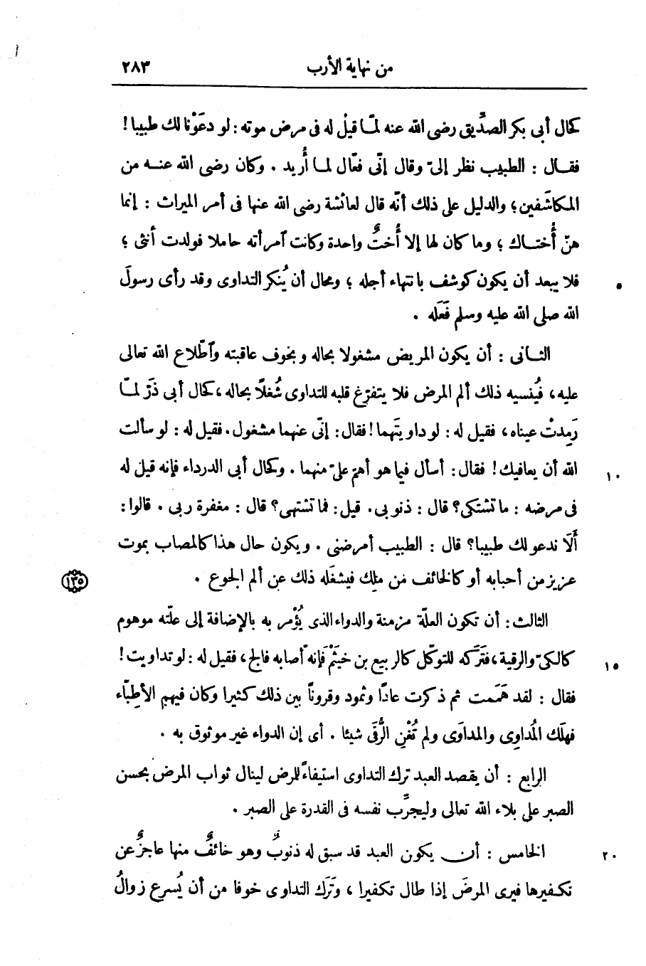 الرابع: أن يقصد العبد ترك التداوى استيفاء للمرض لينال ثواب المرض بحسن الصبر على بلاء الله تعالى وليجرّب نفسه فى القدرة على الصبر.