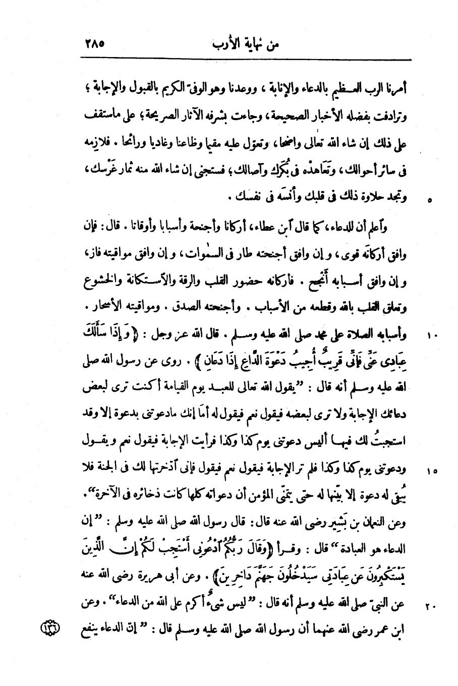 أمرنا الرب العظيم بالدعاء والإنابة، ووعدنا وهو الوفىّ الكريم بالقبول والإجابة؛ وترادفت بفضله الأخبار الصحيحة، وجاءت بشرفه الآثار الصريحة؛ على ما ستقف على ذلك إن شاء الله تعالى واضحا، وتعوّل عليه مقيما وظاعنا وغاديا ورائحا. فلازمه فى سائر أحوالك، وتعاهده فى بكرك وآصالك؛ فستجنى إن شاء الله منه ثمار غرسك، وتجد حلاوة ذلك فى قلبك وأنسه فى نفسك.