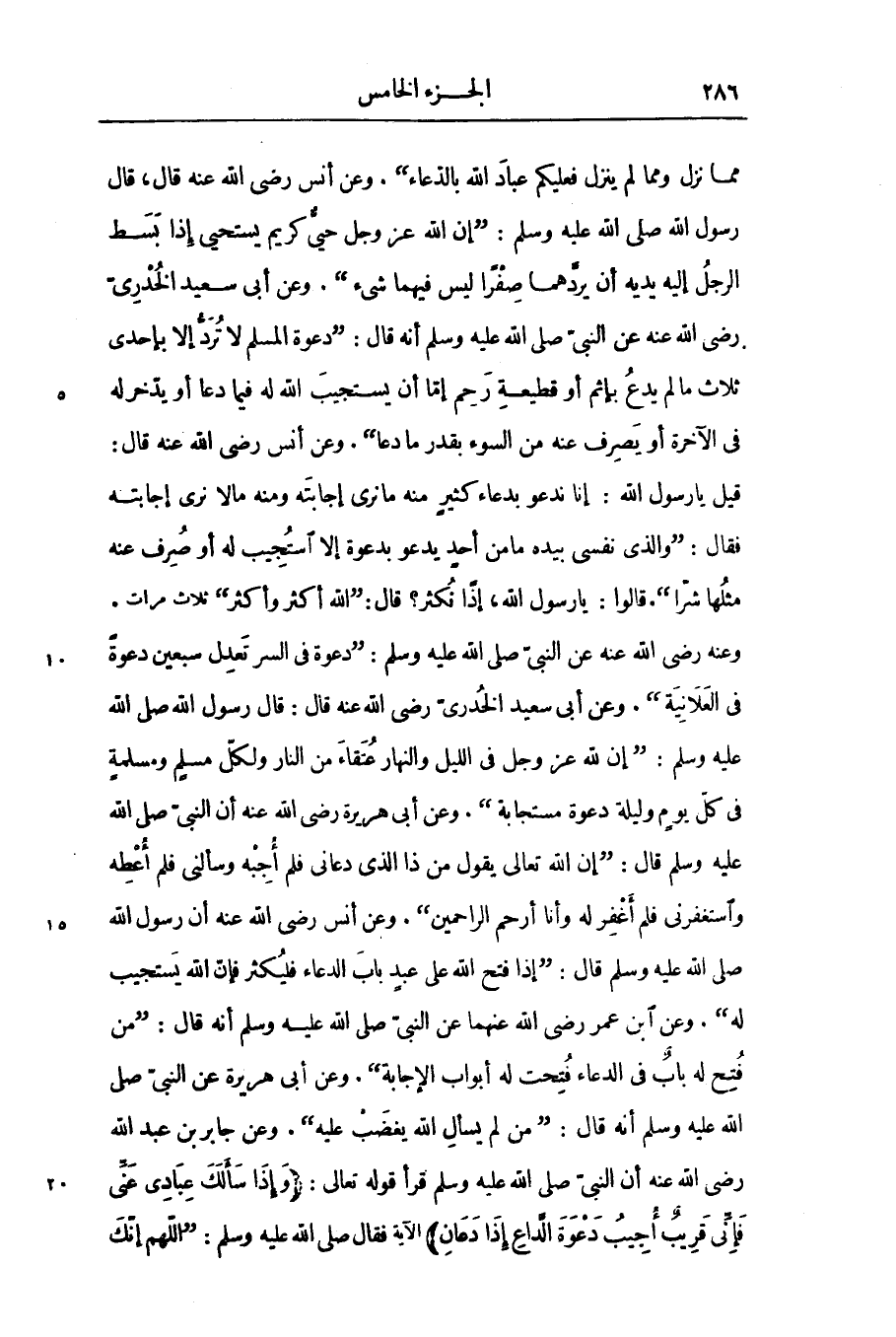 . وعن جابر بن عبد الله رضى الله عنه أن النبىّ صلى الله عليه وسلم قرأ قوله تعالى: وَإِذا سَأَلَكَ عِبادِي عَنِّي فَإِنِّي قَرِيبٌ أُجِيبُ دَعْوَةَ الدَّاعِ إِذا دَعانِ