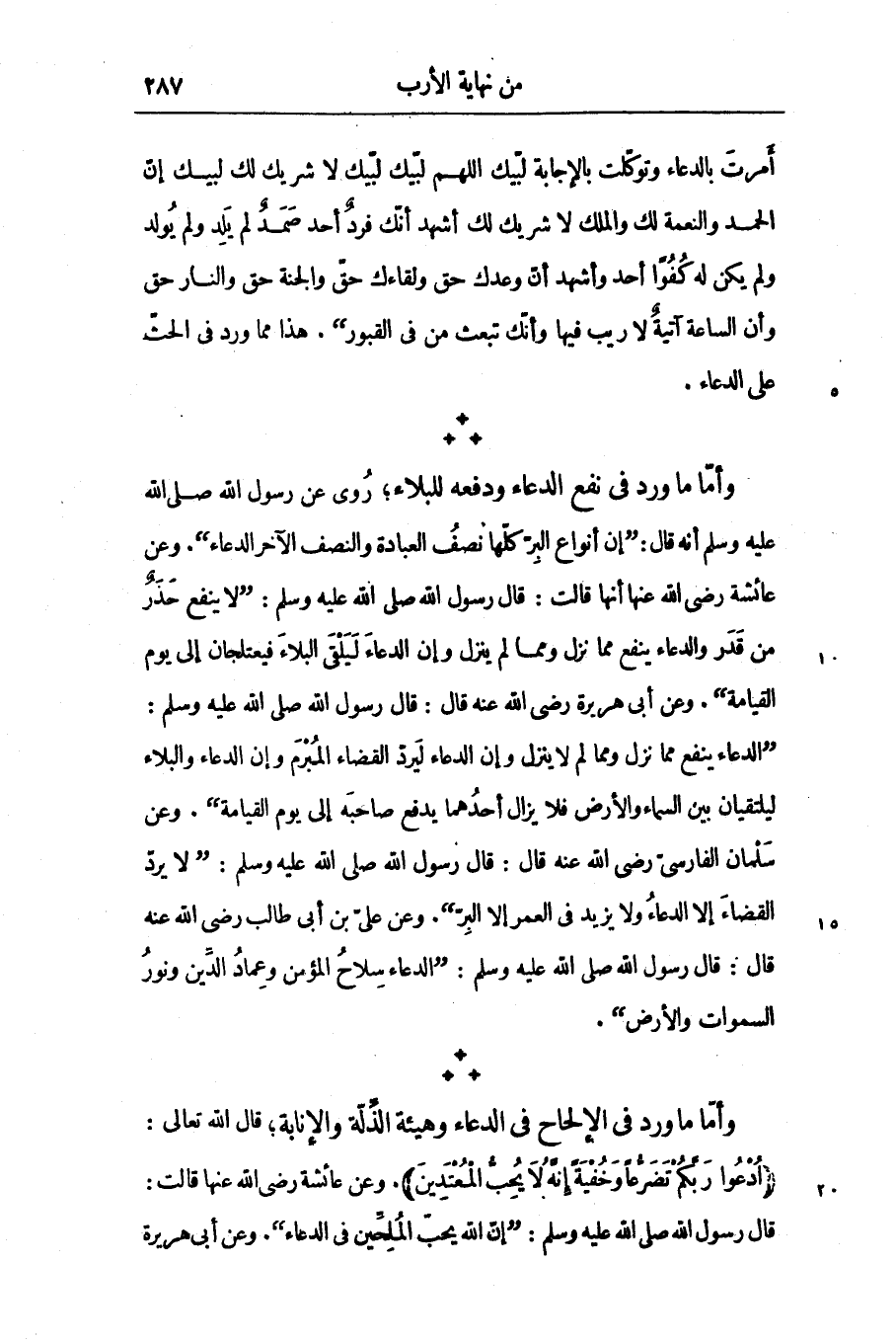 . وعن علىّ بن أبى طالب رضى الله عنه قال: قال رسول الله صلى الله عليه وسلم: «الدعاء سلاح المؤمن وعماد الدّين ونور السموات والأرض» .