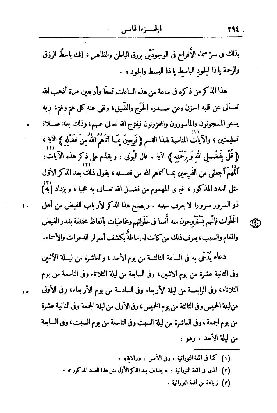 اللهم اجعلنى من الفرحين بما آتاهم الله من فضله، يقول ذلك [2] بعد الذكر الأوّل مثل العدد المذكور، فيرى المهموم من فضل الله تعالى به عجبا، ويزداد [به [3]] ذو السرور سرورا لا يعرف سببه. ويصلح هذا الذكر لأرباب الفيض من أهل الخلوات فإنّهم يستروحون منه أنسا فى خلواتهم ومخاطبات بألفاظ مختلفة بقدر الفيض والمقام والسبب، يعرف ذلك من كانت له إحاطة بكشف أسرار الدعوات والأسماء.