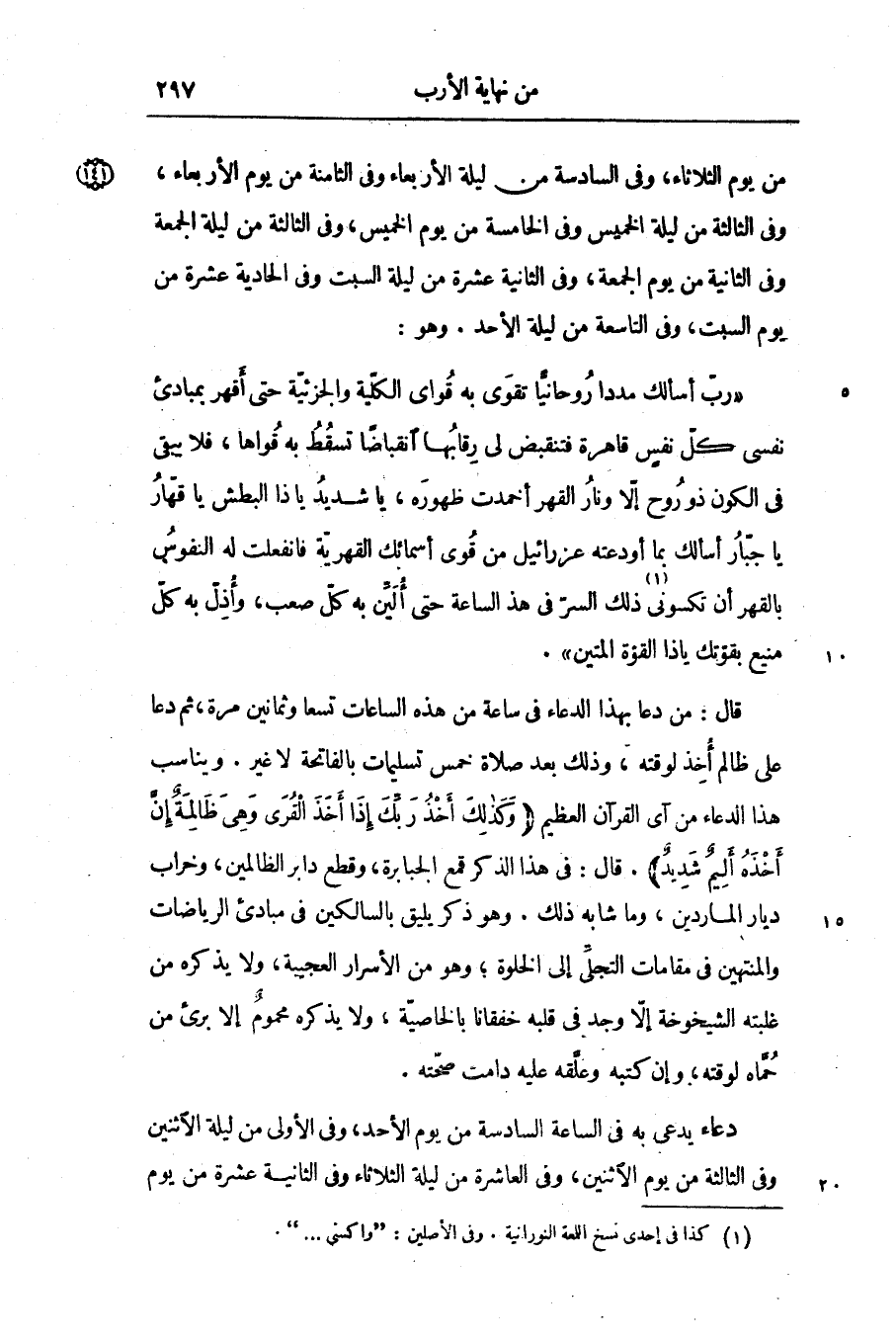 «ربّ أسألك مددا روحانيّا تقوى به قواى الكلّية والجزئيّة حتى أقهر بمبادئ نفسى كلّ نفس قاهرة فتنقبض لى رقابها انقباضا تسقط به قواها، فلا يبقى فى الكون ذو روح إلّا ونار القهر أخمدت ظهوره، يا شديد يا ذا البطش يا قهّار يا جبّار أسألك بما أودعته عزرائيل من قوى أسمائك القهريّة فانفعلت له النفوس بالقهر أن تكسونى [1] ذلك السرّ فى هذه الساعة حتى أليّن به كلّ صعب، وأذلّ به كلّ منيع بقوّتك يا ذا القوّة المتين» .