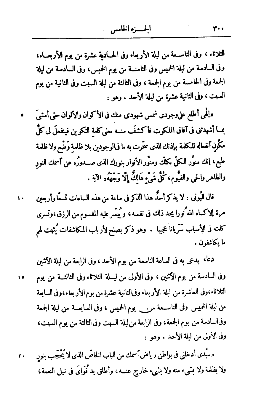 «إلهى أطلع على وجودى شمس شهودى منك فى الأكوان والألوان حتى أمشى بما أشهدتنى فى آفاق الملكوت فأكشف منه معنى كلمة التكوين فينفعل لى كلّ مكوّن انفعاله للكلمة بإذنك الذى سخّرت به ما فى الوجودين بلا ظلمة وضع ولا ظلمة طبع، إنك منوّر الكلّ بكلّك ومنوّر الأنوار بنورك الذى صدوره عن اسمك النور والظاهر والحى والقيّوم، كلّ شىء هالك إلّا وجهه» الآية.