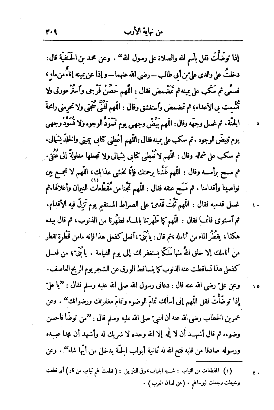 . وعن محمد بن الحنفيّة قال: دخلت على والدى علىّ بن أبى طالب- رضى الله عنهما- وإذا عن يمينه إناء من ماء، فسمّى ثم سكب على يمينه ثم تمضمض فقال: اللهم حصّن فرجى واستر عورتى ولا تشمت بى الأعداء؛ ثم تمضمض واستنشق وقال: اللهم لقّنّى حجّتى ولا تحرمنى رائحة الجنّة. ثم غسل وجهه وقال: اللهم بيّض وجهى يوم تسودّ الوجوه ولا تسوّد وجهى يوم تبيضّ الوجوه. ثم سكب على يمينه فقال: اللهم أعطنى كتابى بيمينى والخلد بشمالى.