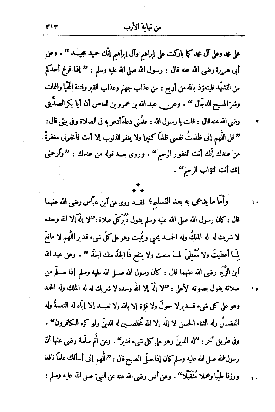 روى عن ابن عبّاس رضى الله عنهما قال: كان رسول الله صلى الله عليه وسلم يقول دبر كلّ صلاة: «لا إله إلا الله وحده لا شريك له له الملك وله الحمد يحيى ويميت وهو على كلّ شىء قدير اللهم لا مانع لما أعطيت ولا معطى لما منعت ولا ينفع ذا الجدّ منك الجدّ»