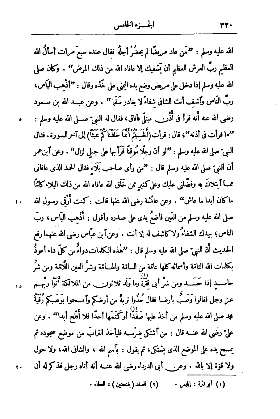 وعن ابن عبّاس رضى الله عنهما رفع الحديث أنّ النبىّ صلى الله عليه وسلم قال: «هذه الكلمات دواء من كلّ داء أعوذ بكلمات الله التامّة وأسمائه كلها عامّة من السامّة والهامّة وشرّ العين اللّامّة ومن شرّ حاسد إذا حسد ومن شرّ أبى قترة [1] وما ولد ثلاثون من الملائكة أتوا ربّهم عز وجل فقالوا وصب بأرضنا فقال خذوا تربة من أرضكم وامسحوا بوصبكم رقية محمد صلى الله عليه وسلم من أخذ عليها صفدا [1] أو كتمها أحدا فلا أفلح أبدا»