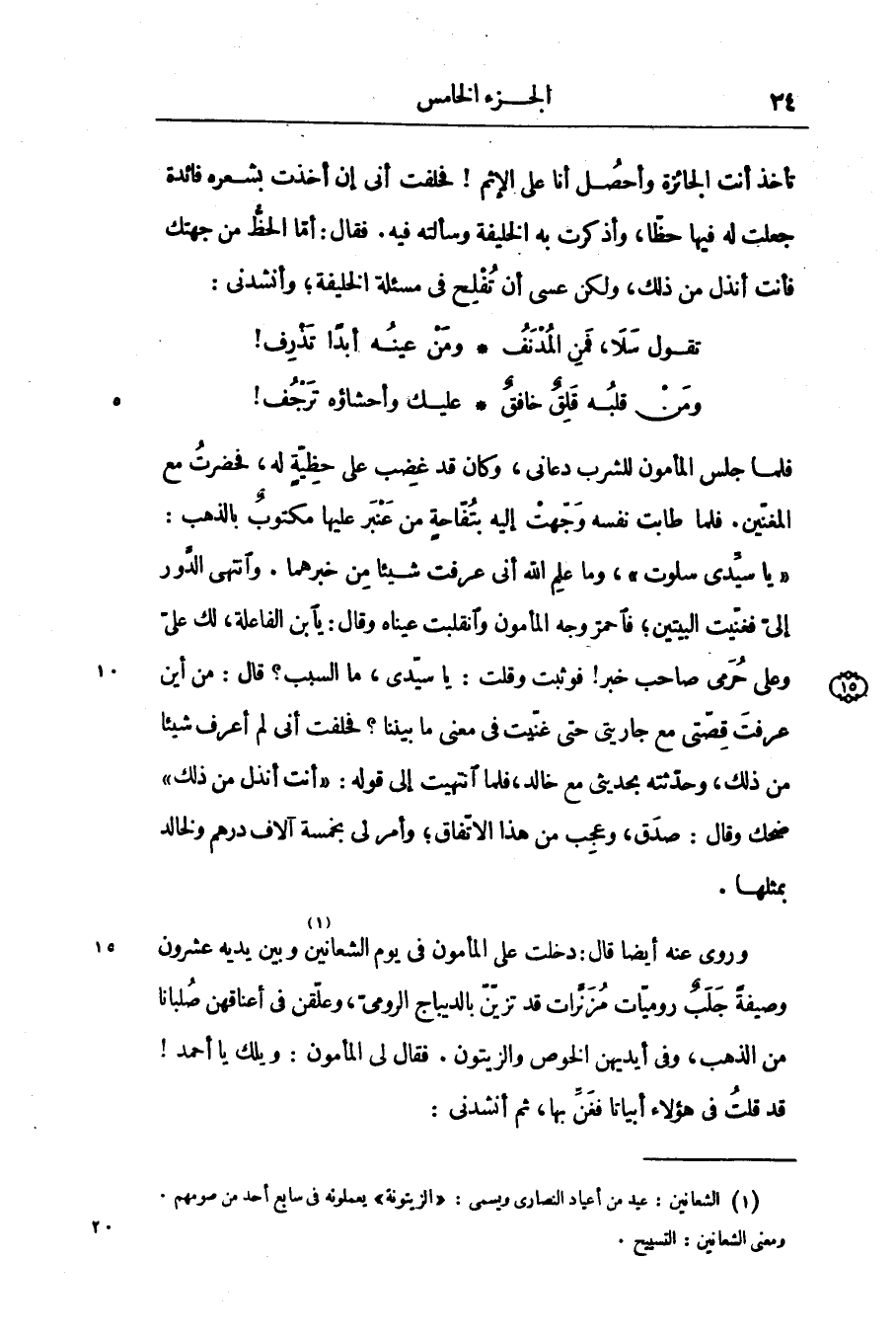وروى عنه أيضا قال: دخلت على المأمون فى يوم الشعانين [1] وبين يديه عشرون وصيفة جلب روميّات مزنّرات قد تزيّنّ بالديباج الرومىّ، وعلّقن فى أعناقهن صلبانا من الذهب، وفى أيديهن الخلوص والزيتون. فقال لى المأمون: ويلك يا أحمد! قد قلت فى هؤلاء أبياتا فغنّ بها، ثم أنشدنى:
